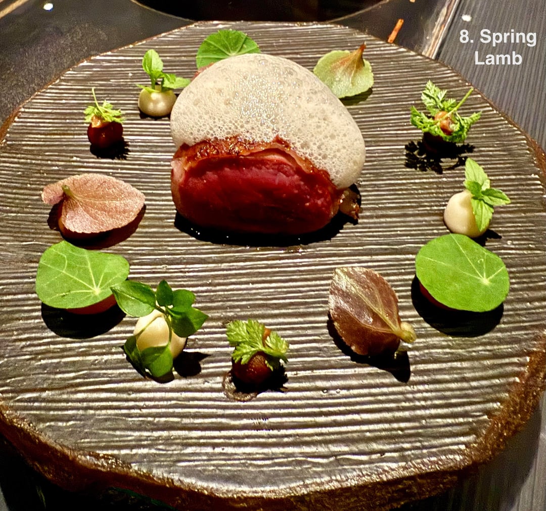 8. Spring Lamb – yeast fudge, magnolia. This is a lamb cooked in its fat cap and topped with magnolia foam. This was a very good lamb dish. It was paired with a Belgian lambic beer, a 3 Fonteinen oude geuze which was nice to see as the beer pairing selection.
