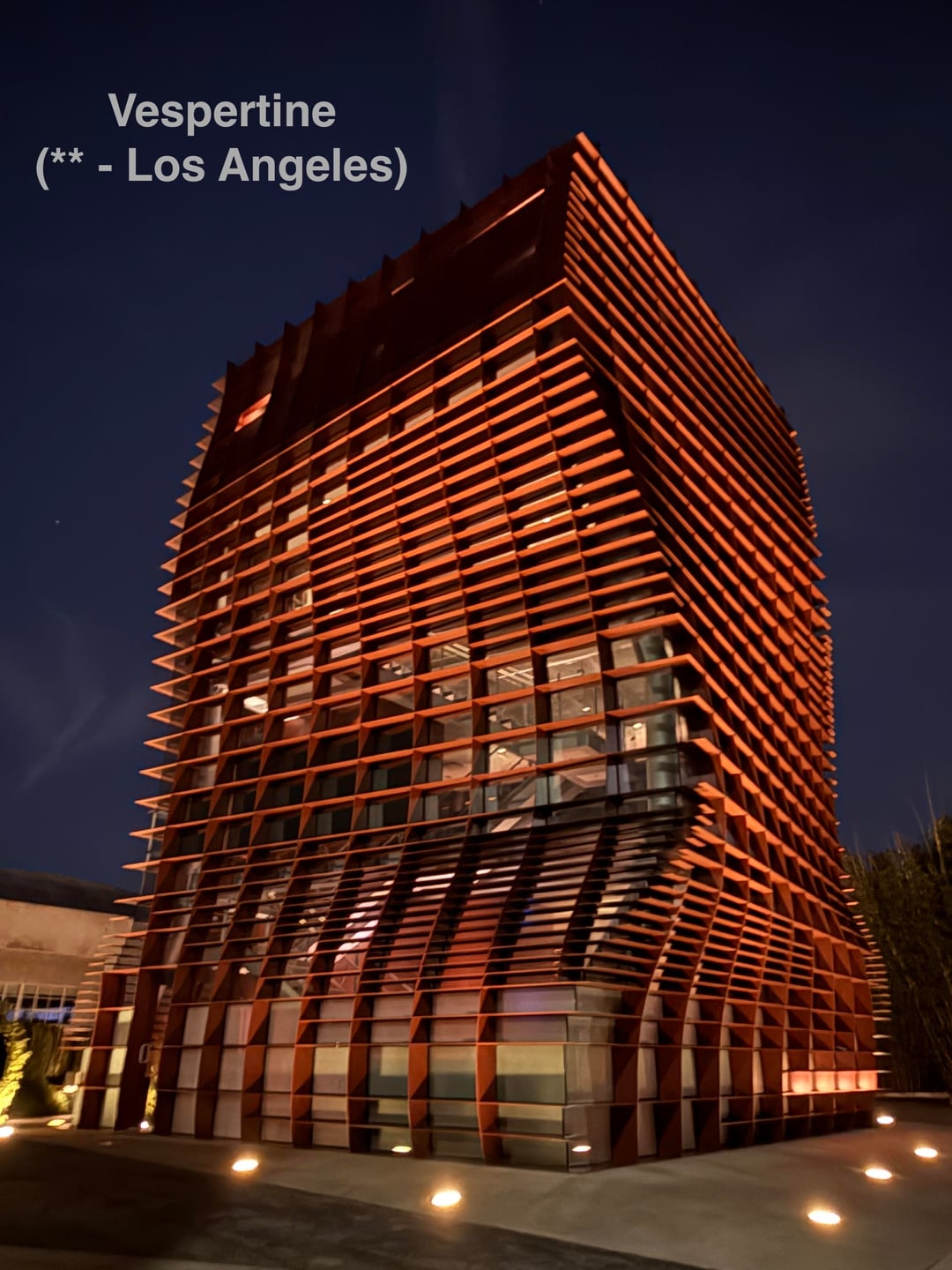 1. Vespertine building – named ‘Waffle’, the building is designed by architect Eric Owen Moss. The neighborhood seemed to be a bit industrial that is transforming into a creative neighborhood with architecturally interesting buildings. You check in at the front door and are taken to a patio with heaters and blankets, and then someone takes you inside and up an elevator to the third floor kitchen. On this day the chef Jordan Kahn was there. Then you descend down a set of stairs to the second floor to the main dining room to start your meal.