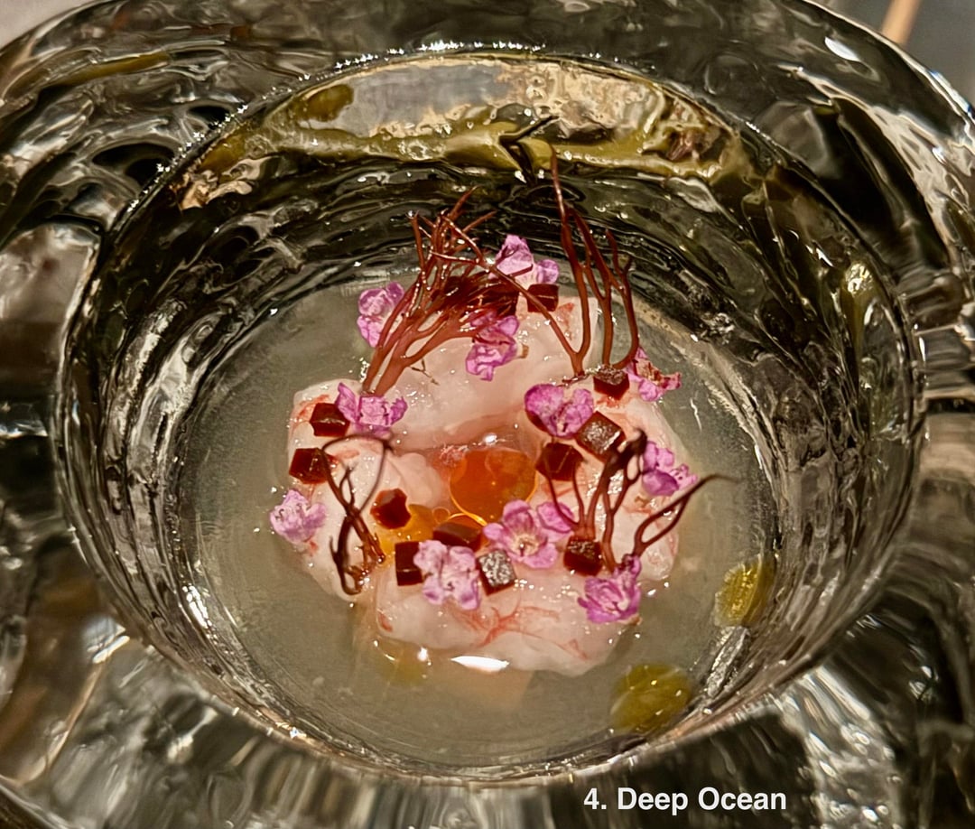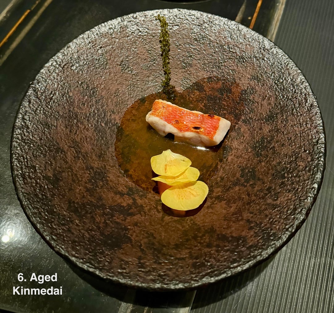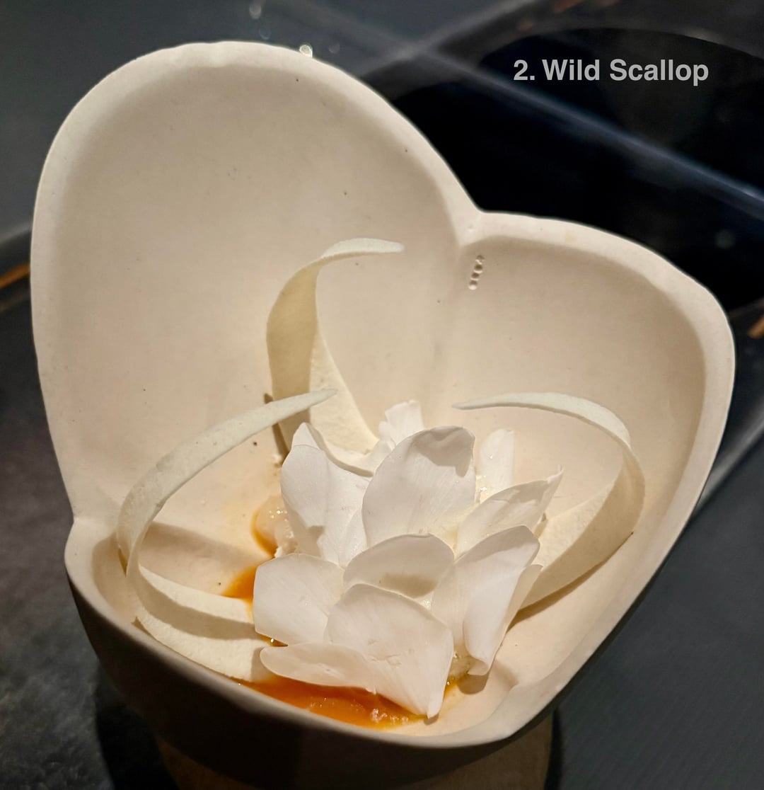 5. Obsidian Mirror – smoked mussel, buddha’s hand. Visually stunning, this is served with a mussel shell as your spoon to scoop up the smoked mussel cream under the squid ink top. A nice dish. It was paired with a white wine Alfredo Egia ‘izaki’ 2021 from Basque Country, Spain.