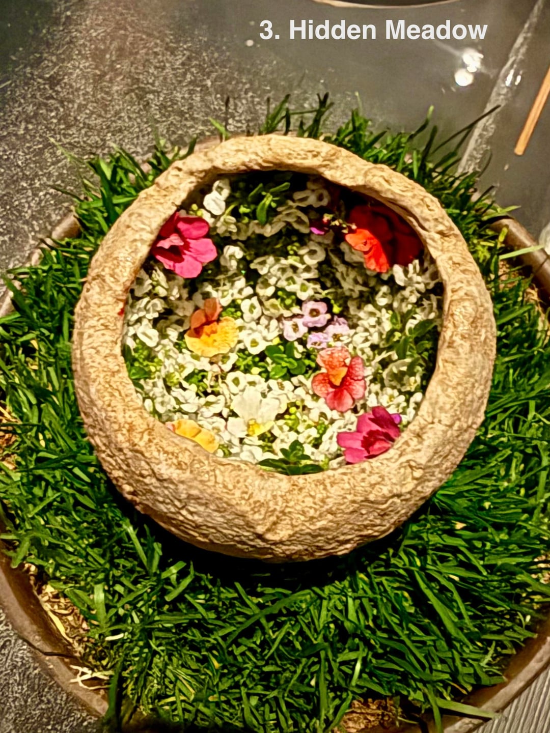 3. Hidden Meadow – preserved tomato, wild forest berries. This is served upside down to you, where the dish just looks like a rock. They then ask you to turn the rock over and the dish is presented to you. There’s an onion and almond milk cream holding everything to the side of the rock bowl. Then they add a Turkish pepper sauce and some toasted buckwheat into this dish. Visually stunning and a fun dish, it tasted OK. This was paired with the first NA drink a rose of pinot noir juice (from Navarro Vineyards in Mendocino) and pink peppercorn. Great NA drink.