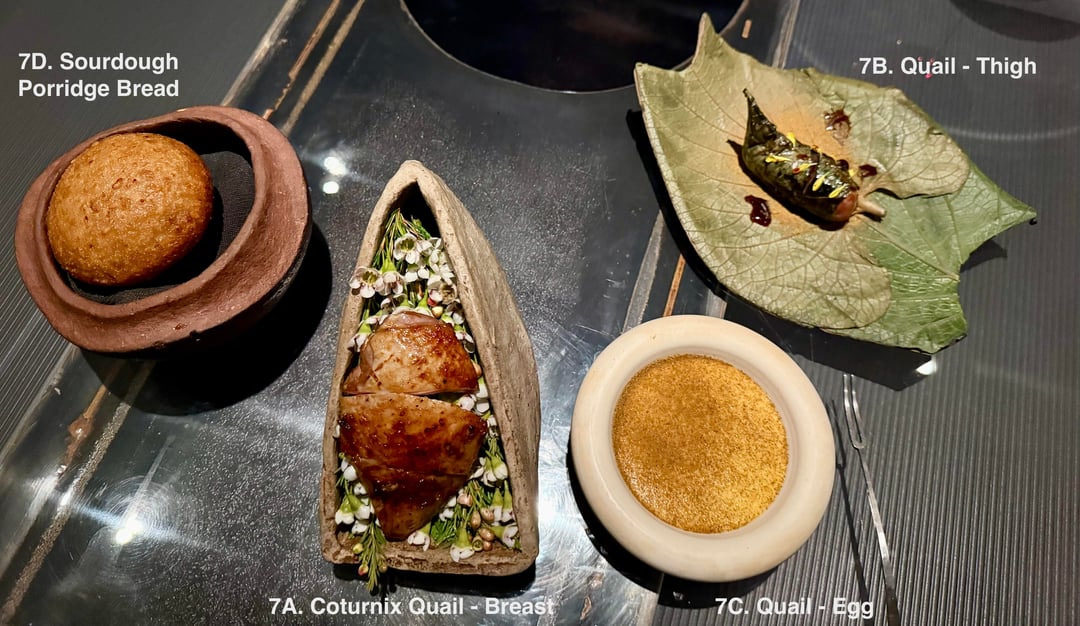 7. Coturnix Quail and Sourdough Porridge Bread – This is four dishes with a different quail component. The quail itself is from Wolfe Ranch in Vacaville, California. There’s the (7A) quail breast which was very good, (7B) a quail thigh wrapped in a leaf which was OK, (7C) a quail egg emulsion sauce which went nice with everything, and (7D) a sourdough porridge bread with heirloom peel-corn oats and quail fat that has been fried and was perfect to soak up the remaining emulsion. This is all paired with a red wine from the Canary Islands.