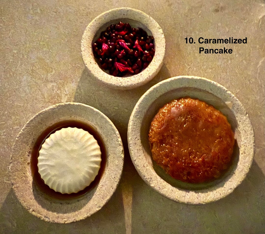 10. Caramelized Pancake – lamb fat, single-malt scotch. The pancake is coated with lamb fat and you top the peaty Laphroaig 10 scotch infused cream and blackberries from Oregon onto the pancake. A very nice dish where the combination of the three components work well. This was also served with a Douglas fir tea infusion which was OK.