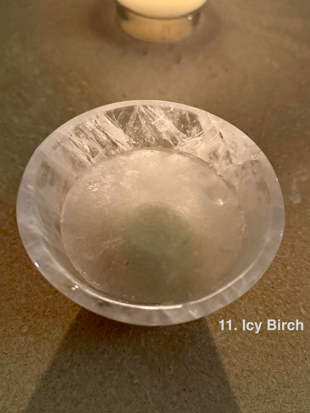 11. Icy Birch – parsnip, reduced milk. This is a frozen birch water disc placed on top of a parsnip and something else ice cream. Good dish.