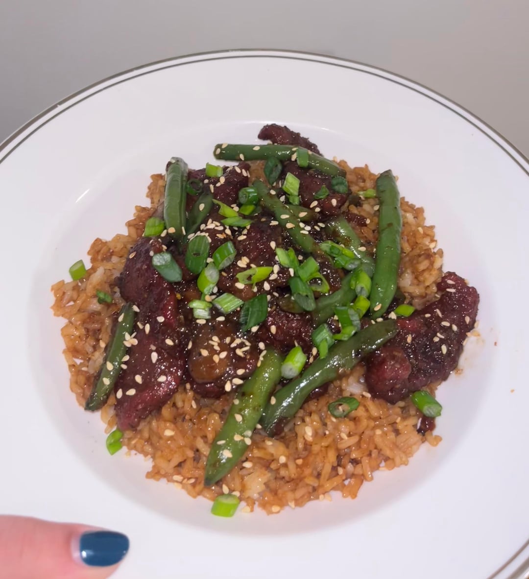 2. Stir-fried flank steak, green beans, + mushrooms w/ miso rice