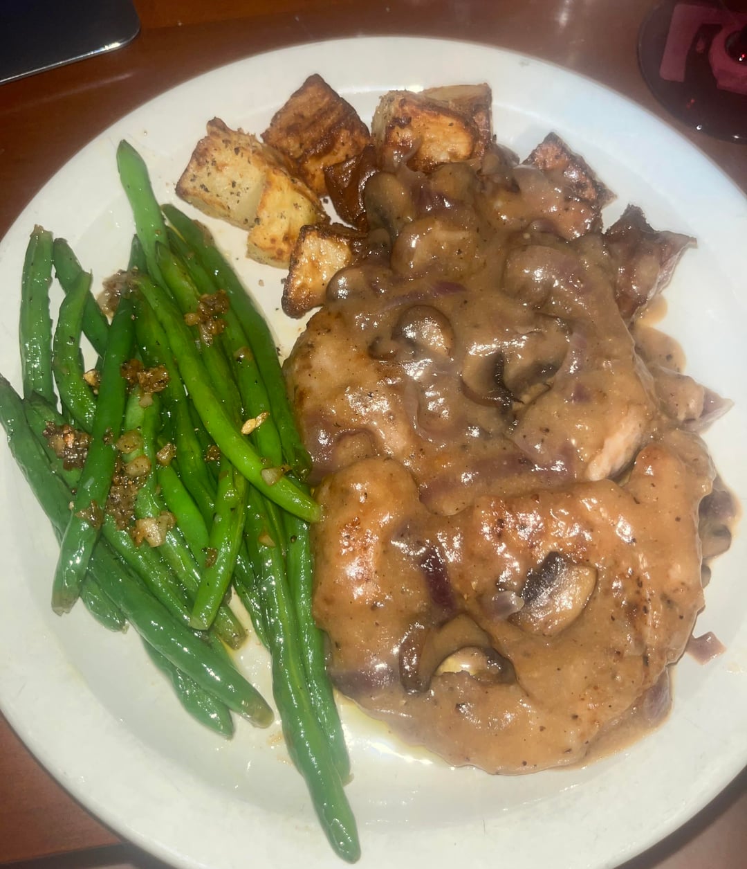 6. Smothered pork chops w/mushrooms + onions, green beans, roasted potatoes
