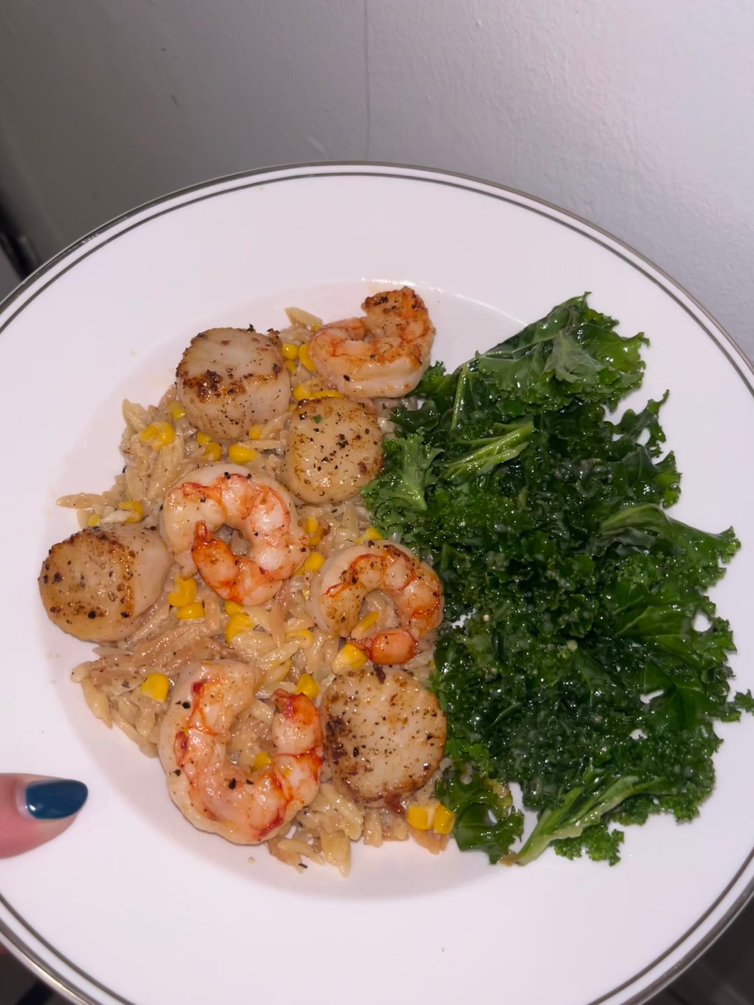 5. Orzo w/ Argentinian shrimp, scallops, shrimp, corn, goat cheese + kale Caesar salad