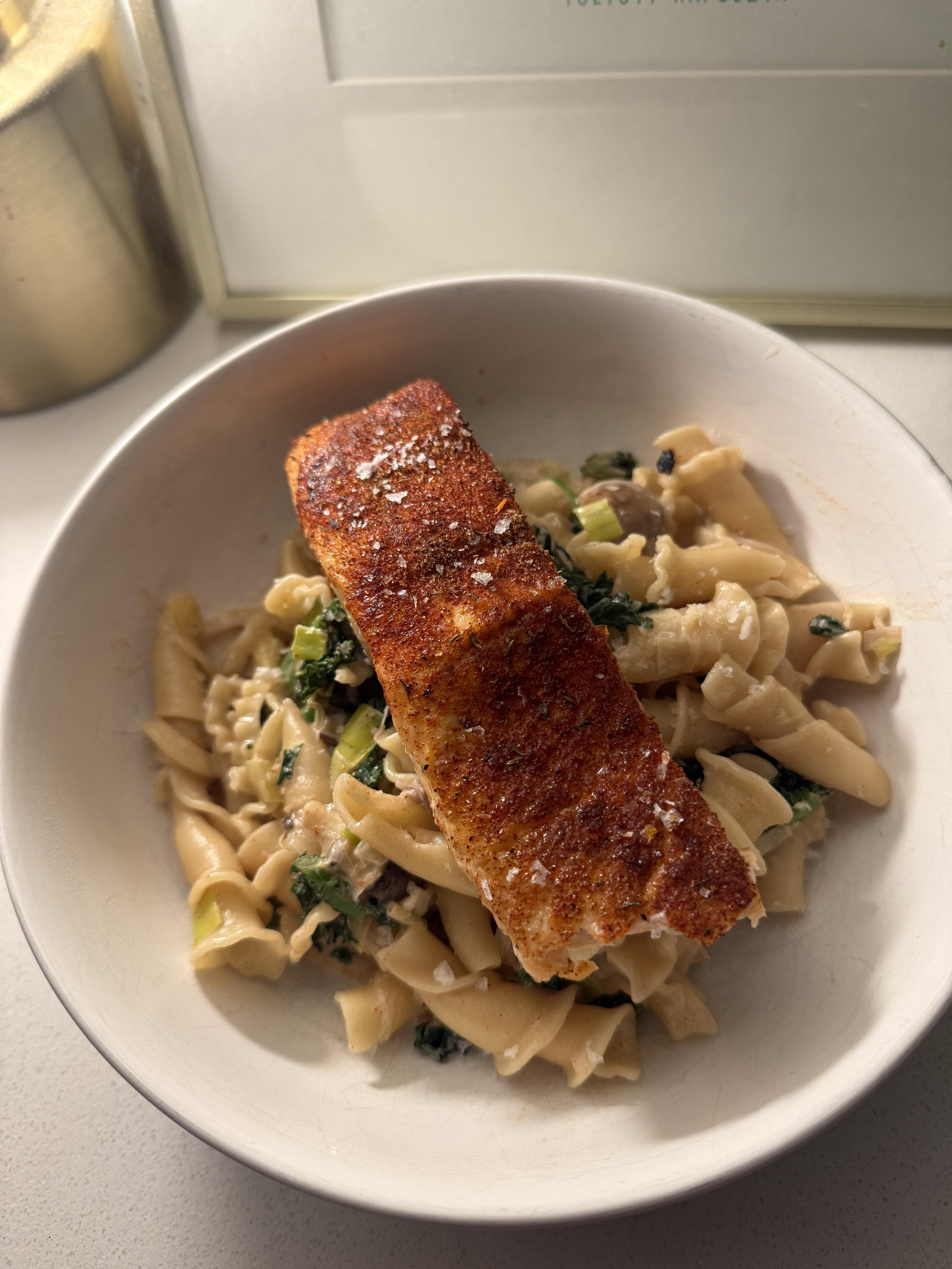 – Pasta: I sautéed leeks, garlic, mushrooms, and kale. Once those were cooked down, I added a pint of half & half (you can use cream, I didn’t have any, I also didn’t have any hard cheese or else I would have grated some in too.) I seasoned the sauce to taste with Cajun seasoning & smoked paprika.