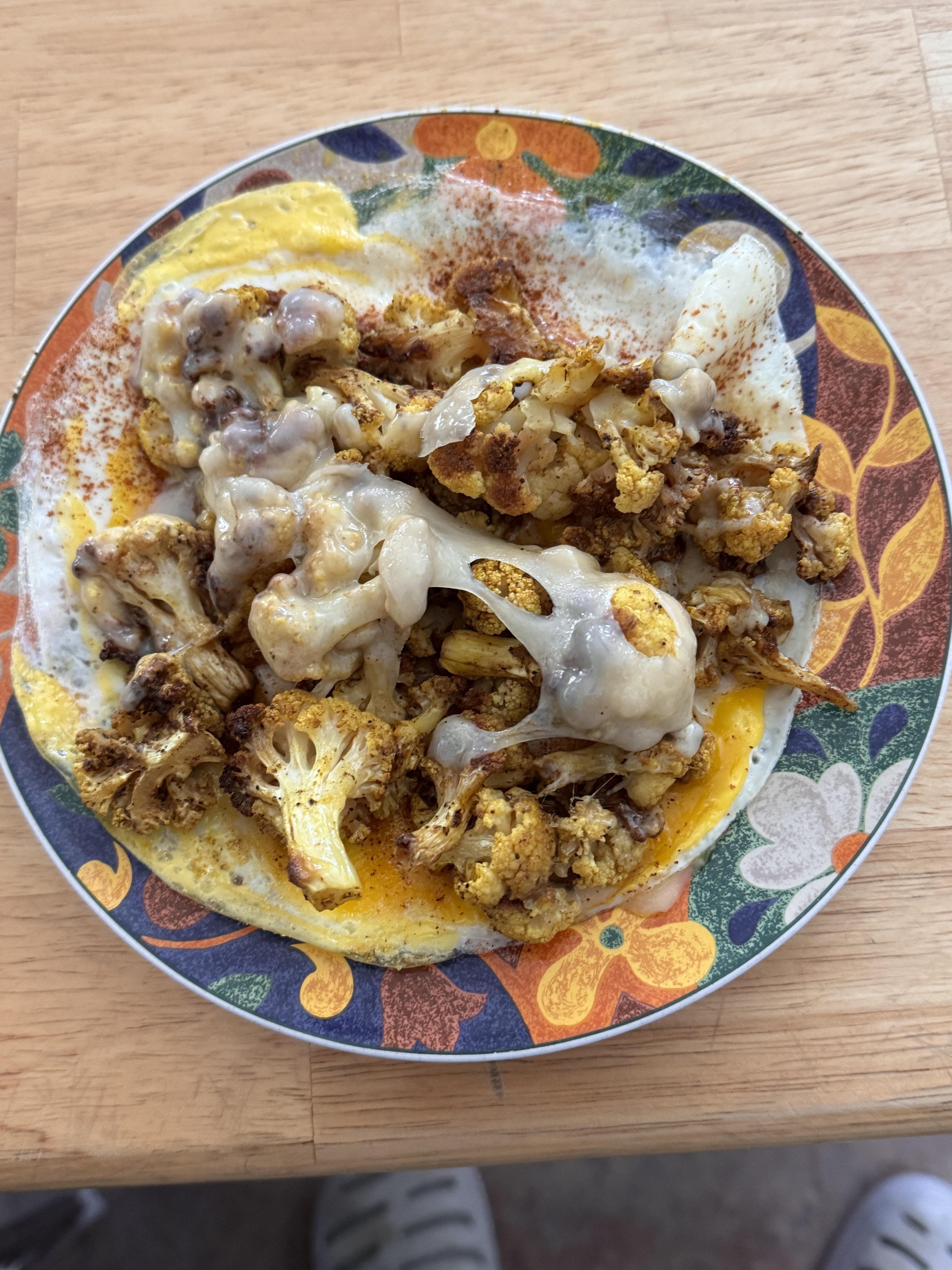 Curried Roasted cauliflower florets with Swiss cheese on two egg omelette with smoked paprika by TallChef60 Food Porn