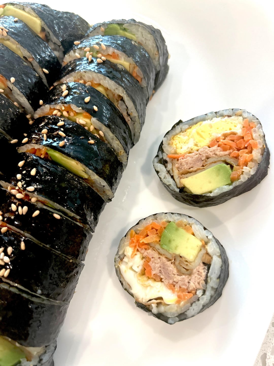 WOWWWW… this looks *so* good, honestly. The gimbap is rolled beautifully, clean layers, generous filling, and that shine on the seaweed with the sesame seeds on top is chef’s kiss. Homemade gimbap always has that extra comfort factor, and this looks cozy in the best way.