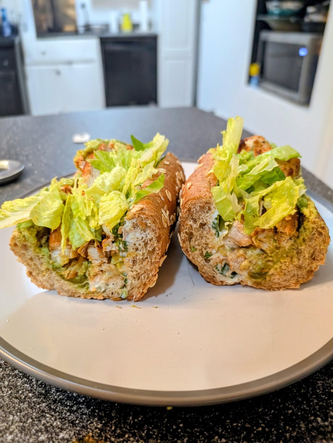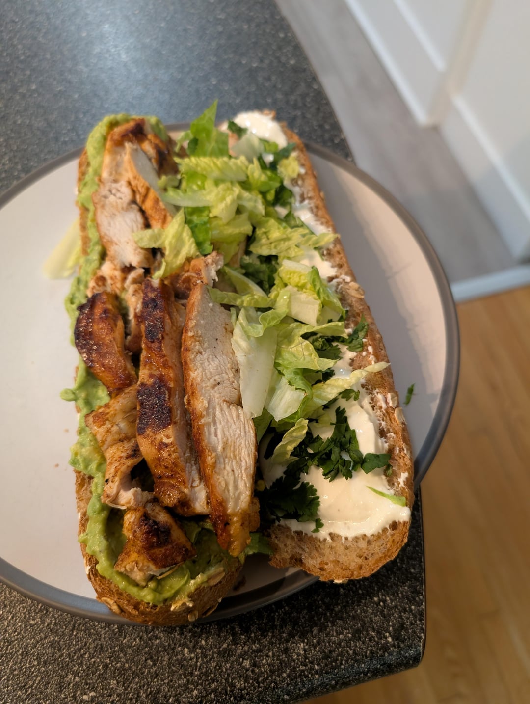 Pan seared blackened chicken, guacamole, Greek yogurt and sour cream crema, cilantro, hot peppers and lettuce. by reggiebobby Food