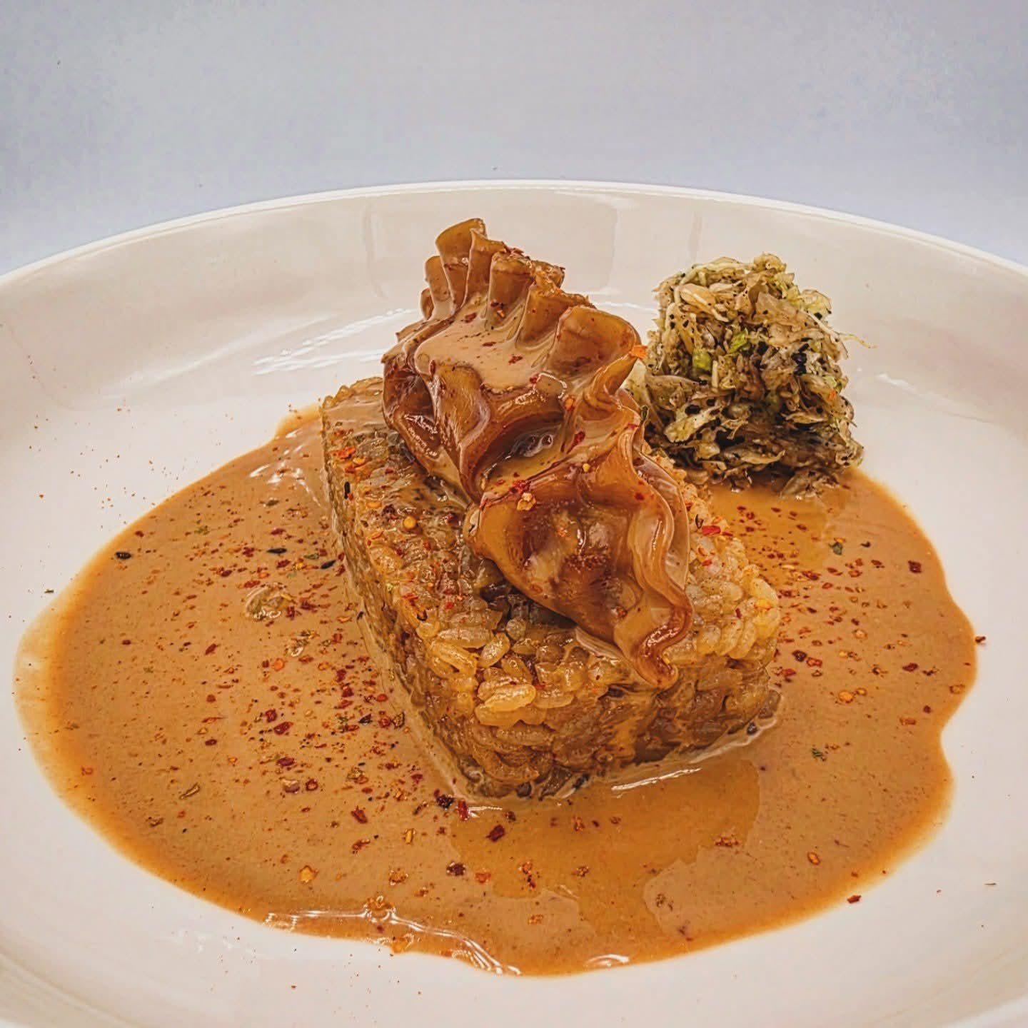 Bulgogi mandu curry cream on beef broth/marrow rice with quick-pickled cabbage: urfa biber, fish salt, sesame oil, and black vinegar