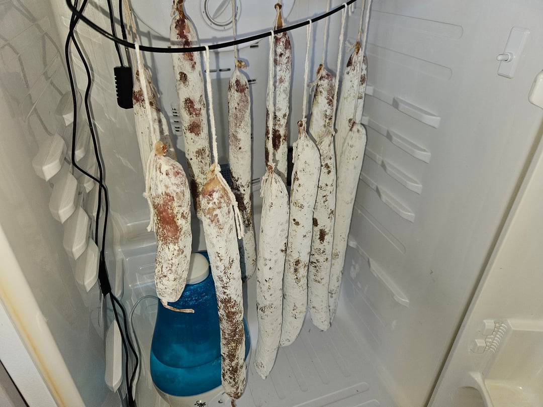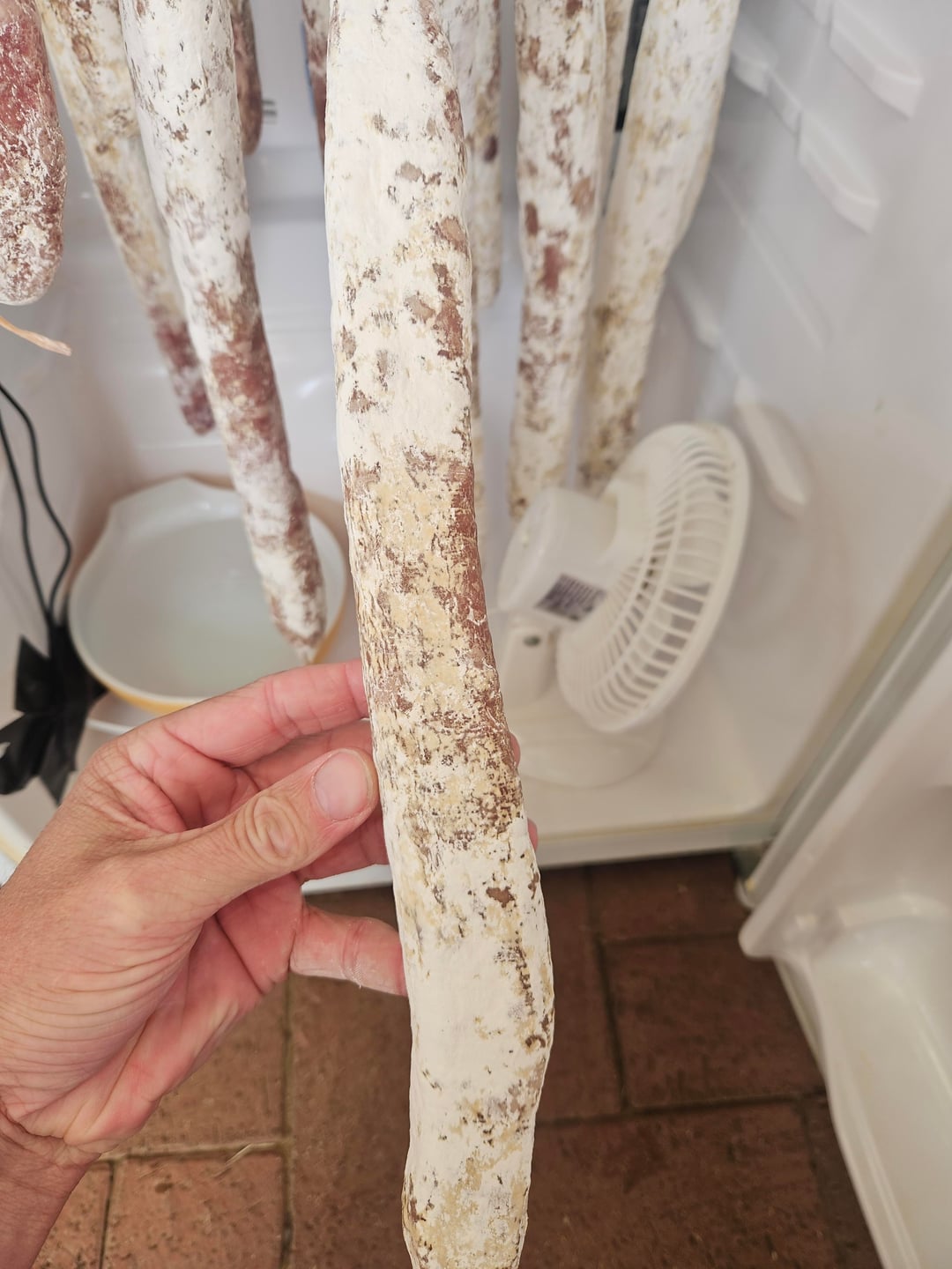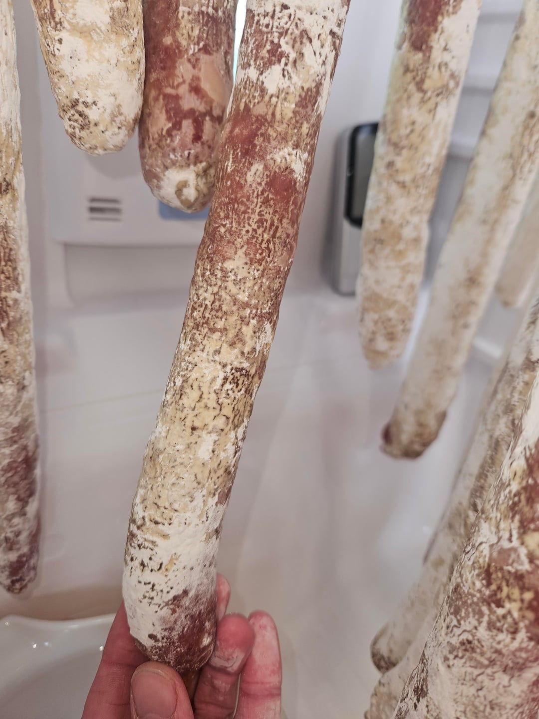 My salami are doing that after nearly 3 months. My guess is the mold has eaten everything it could and is simply dying off. If anyone knows different, please chime in!