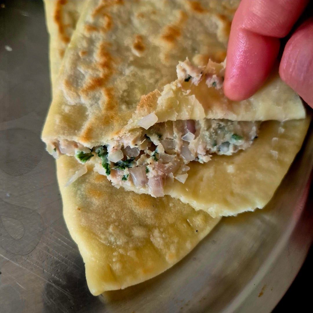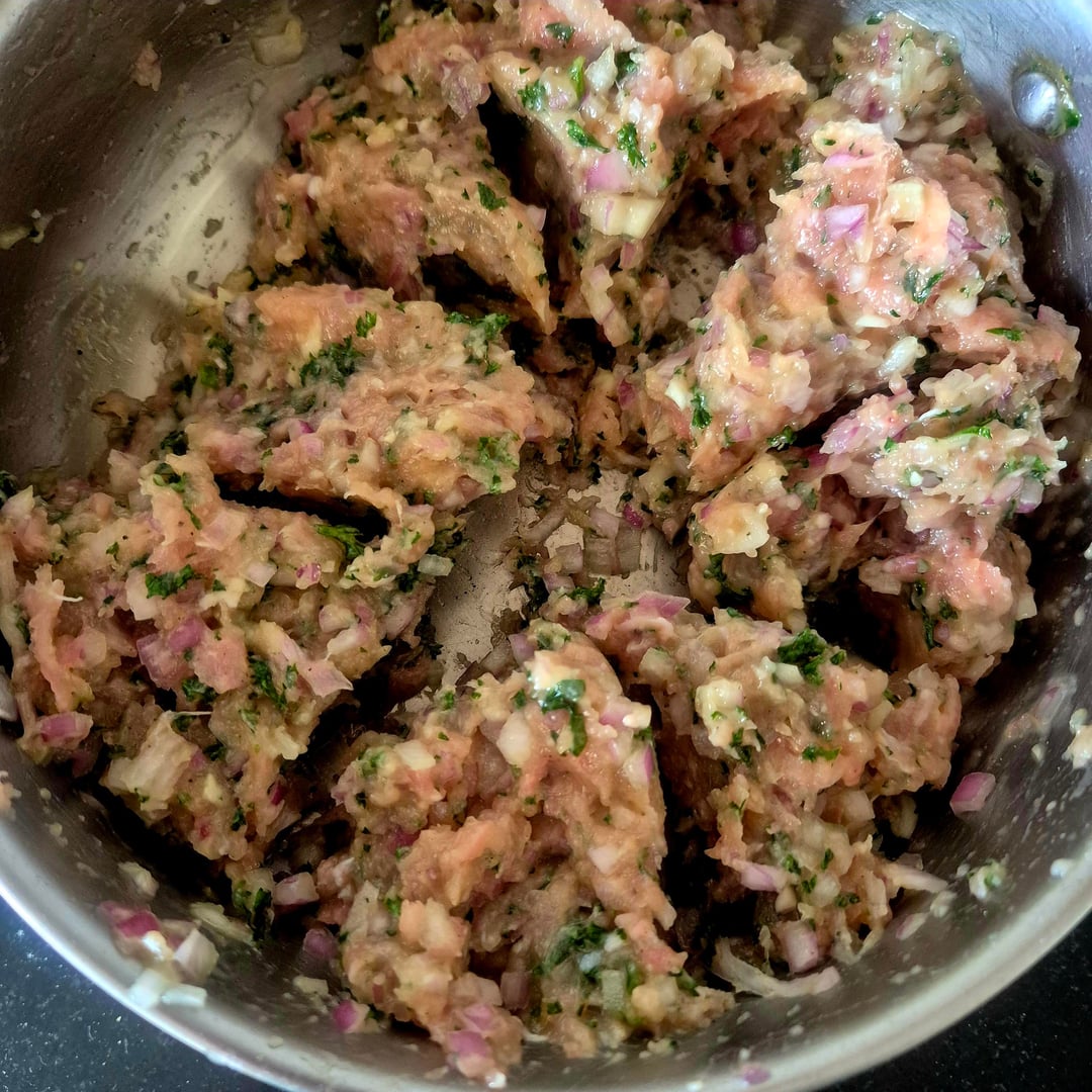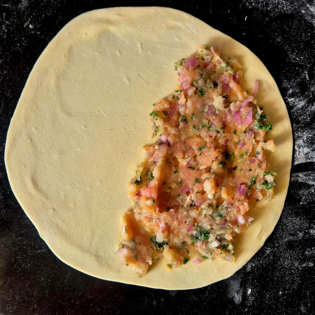 Yantik is made from a unleavened wheat dough filled with ground meat (usually beef or lamb, but I used chicken today), spiced with plenty of chopped onions, black pepper and chopped parsley.