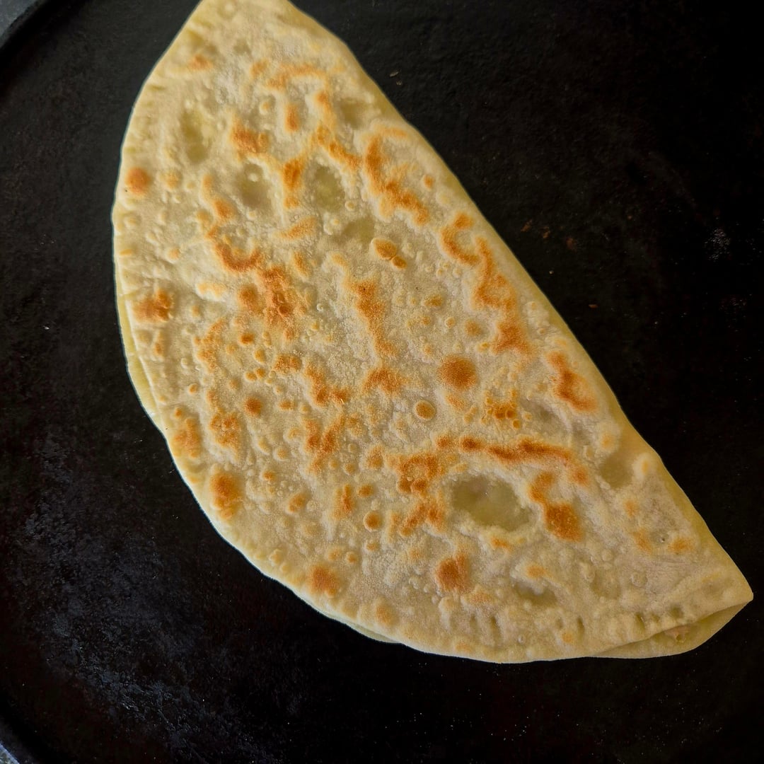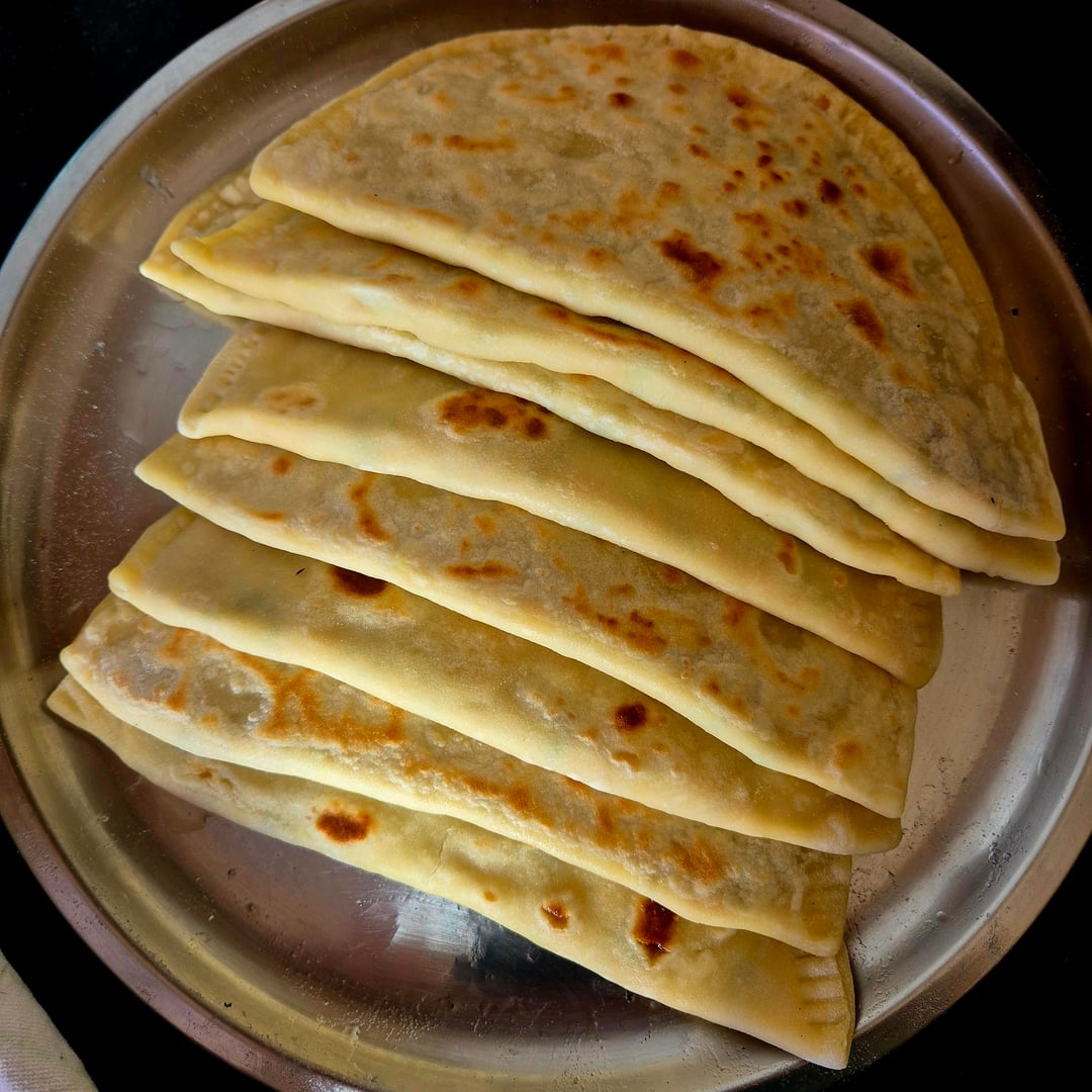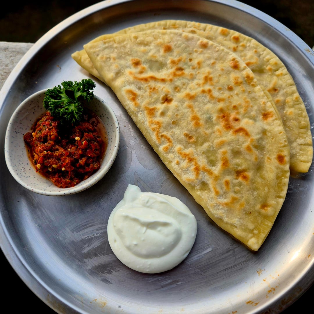 If you deep fry these, you get chebureki, but I love this griddled version. I served them with sourcream and adjjka, a sauce of red chili, bell peppers, garlic and various spices.