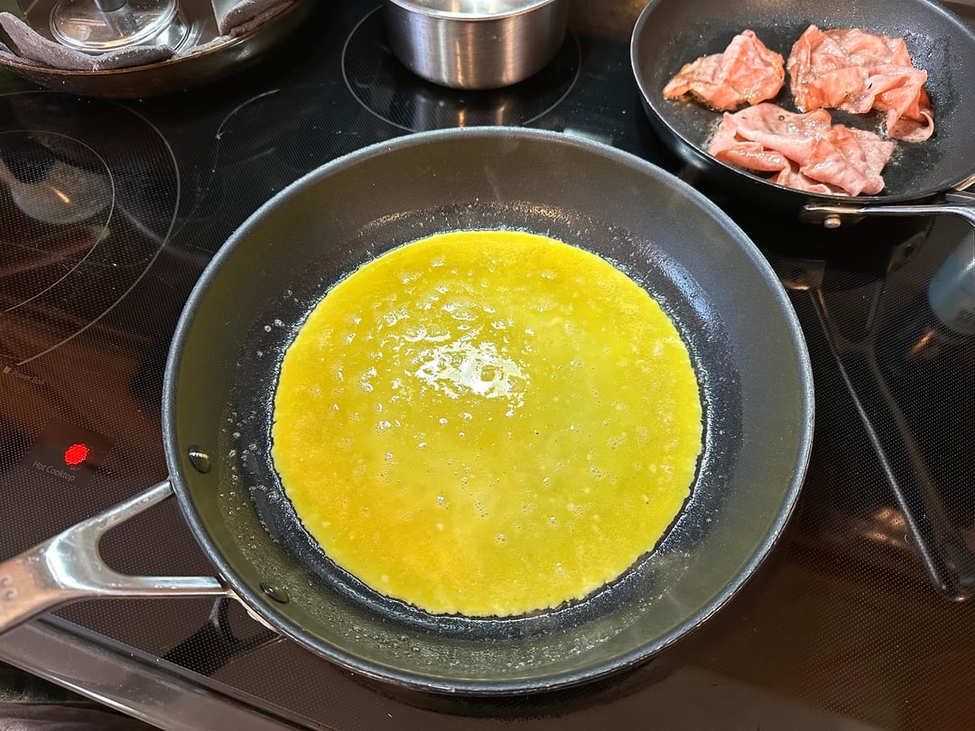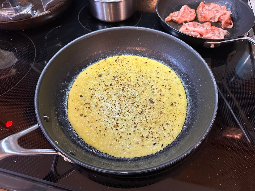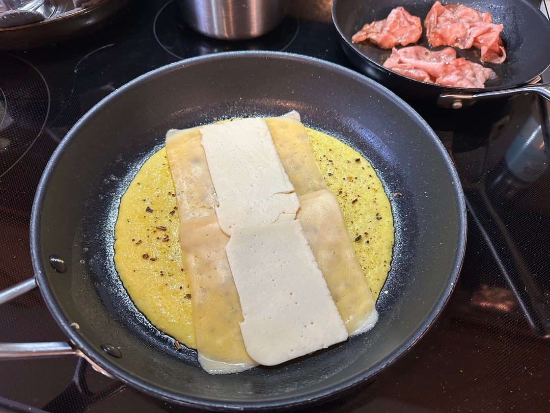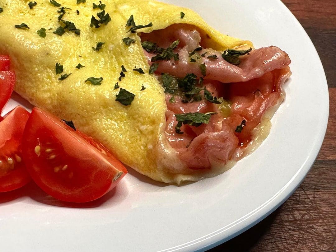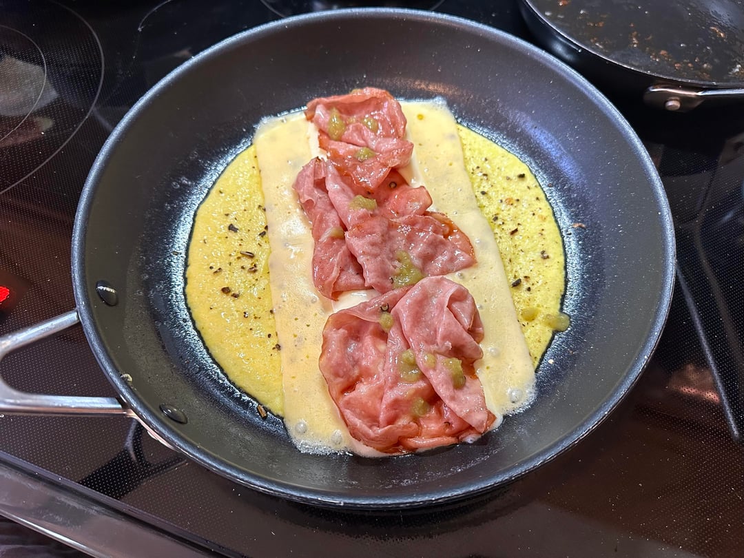One-egg omelette with pan-fried mortadella, Havarti and Cooper Sharp American, seasoned with Flatiron Hatch green pepper flakes and green habanero hot sauce.