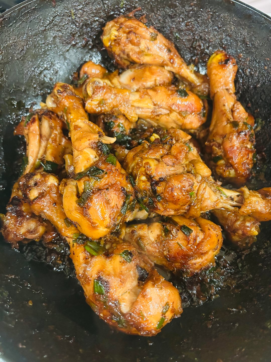 I browned the chicken drumsticks first, then added minced garlic and scallions, soy sauce, oyster sauce, sugar, mirin, and a little water.