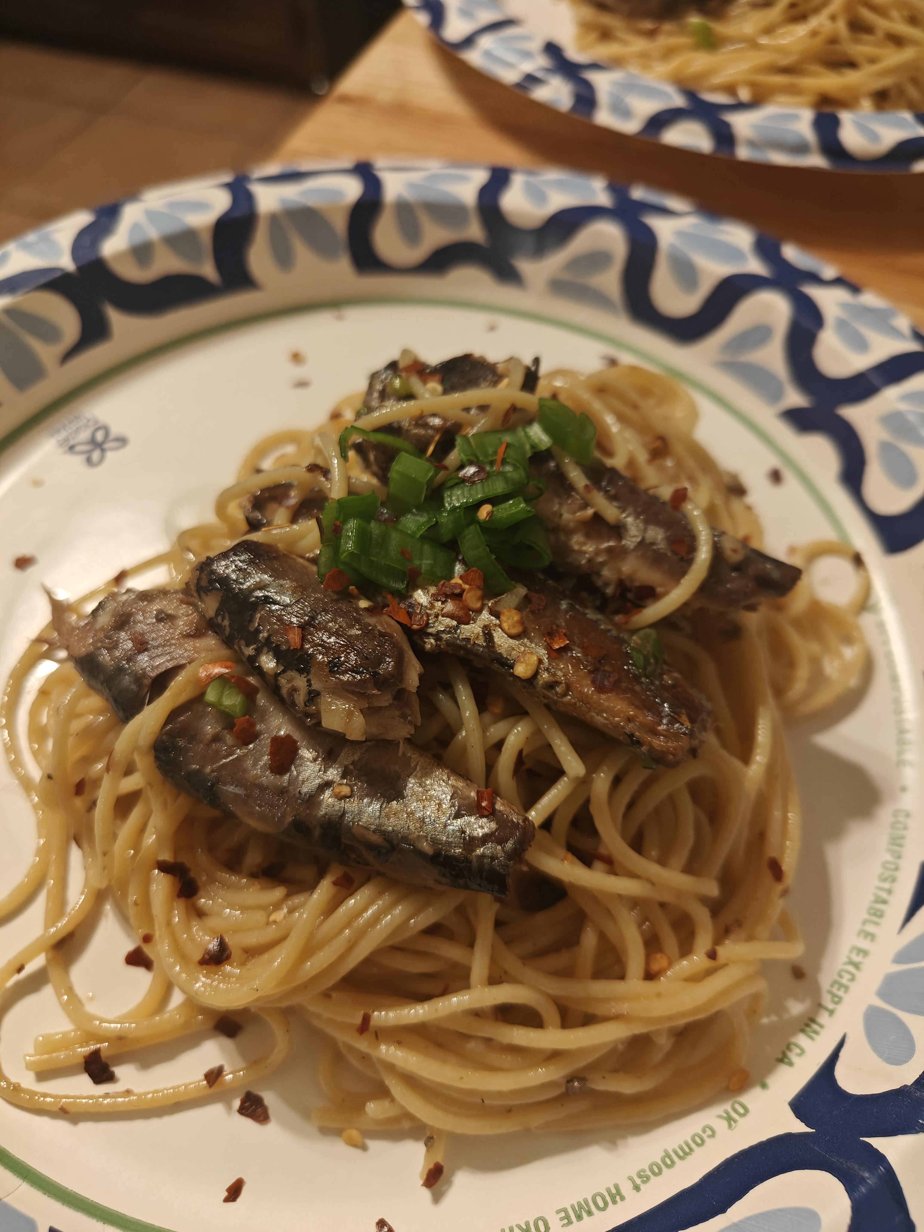 Sardines sauteed with garlic and chili flakes + protein pasta. Quick and tasty meal. by lrick87 Dinner Tonight Tonight's Dinner