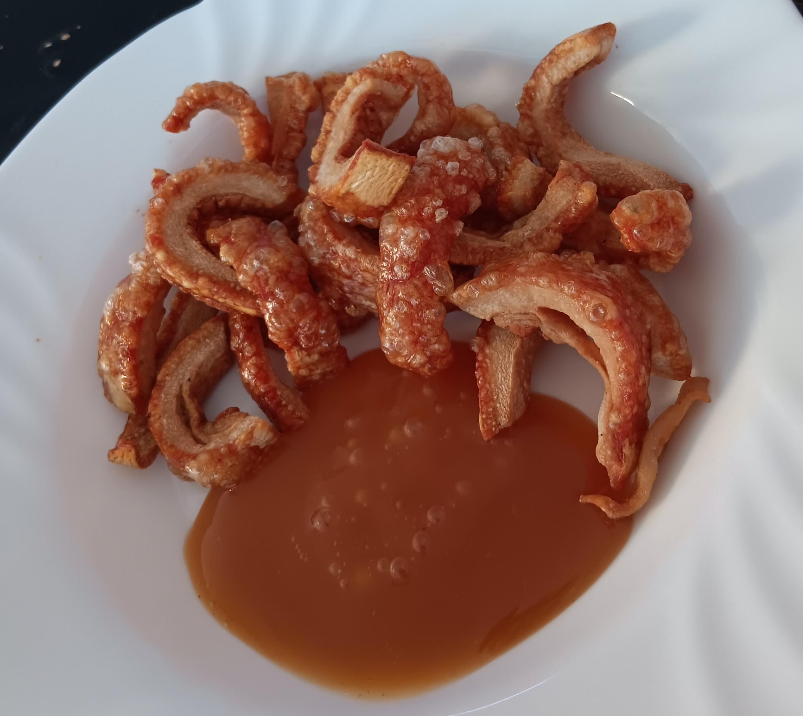 Pork Cracklings off the pulled pork i am making atm. 20min in Air fryer. some cheap Sweet/sour sauce leftover.