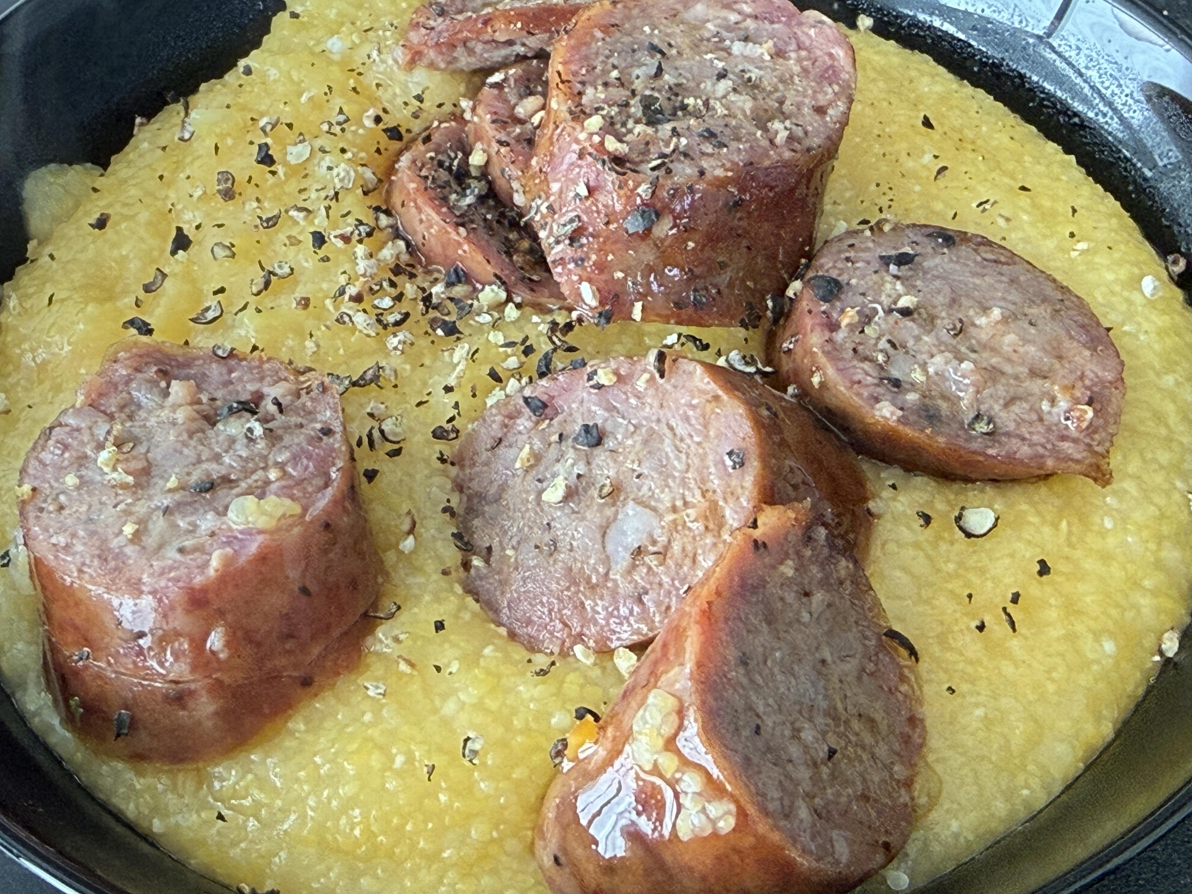 Creamy polenta + aged cheddar, finished with White Smoke’s 100% beef sausages. Comfort food done right by japanfoodies Food