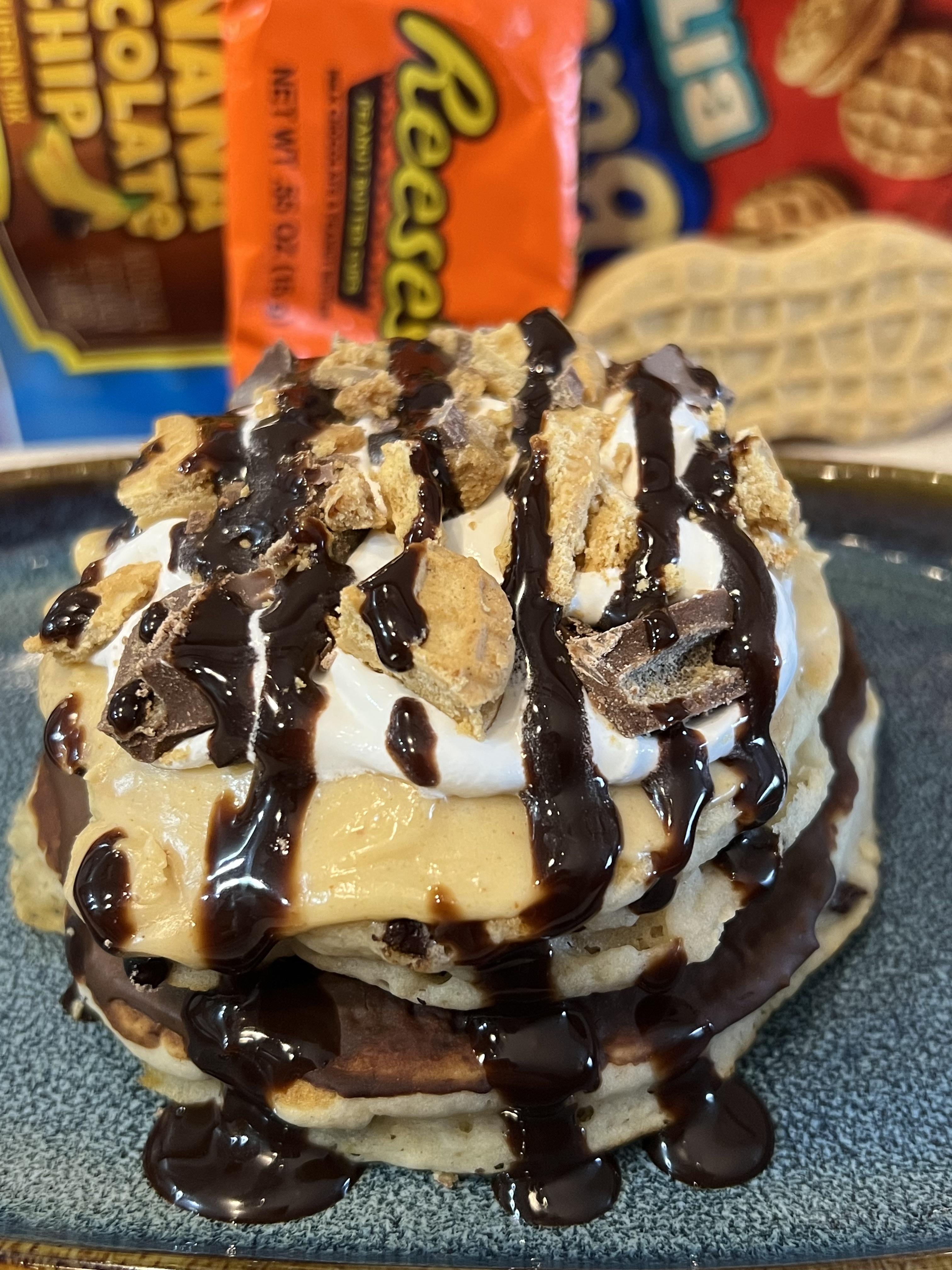 Chocolate Chip Banana Pancakes Stuffed with Chocolate Peanut Butter and Topped with Peanut Butter Buttercream Frosting, Cool Whip, Nutter Butter Cookies, and a Reese’s Peanut Butter Cup by Doughboy88_18 Food