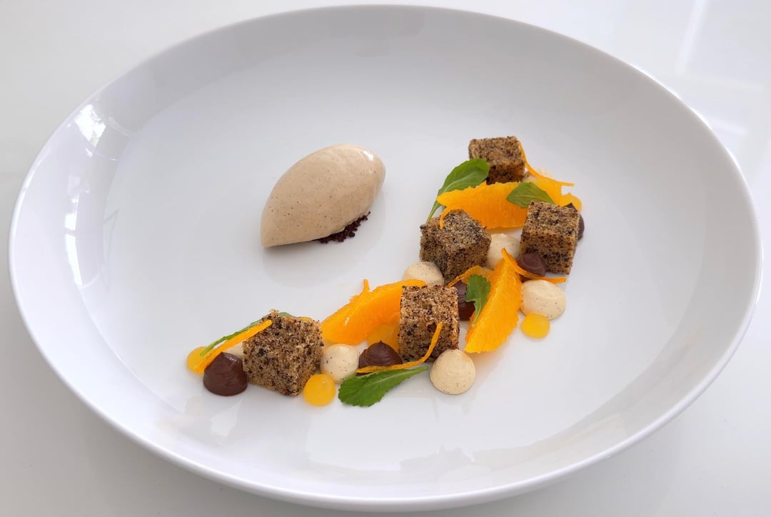 I love the presentation and the flavors sound great. Whatever that herb is looks good too, by adding some green, but I feel they would be unpleasant to eat. I imagine them sticking to the roof of my mouth or getting caught between my teeth. Maybe try candying them (eggwhite wash, dipped in sugar) to give them some bite?