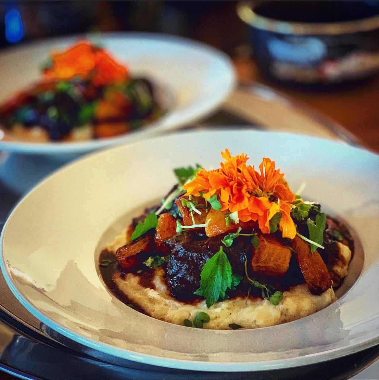 Braised short ribs on truffle mash, with roasted garlic and carrots, demi glace with a touch of port, and some plants on top. It’s simple, but yummy! Made them for a private catering when I was just starting out. 💝 by AveryRuault Food Porn