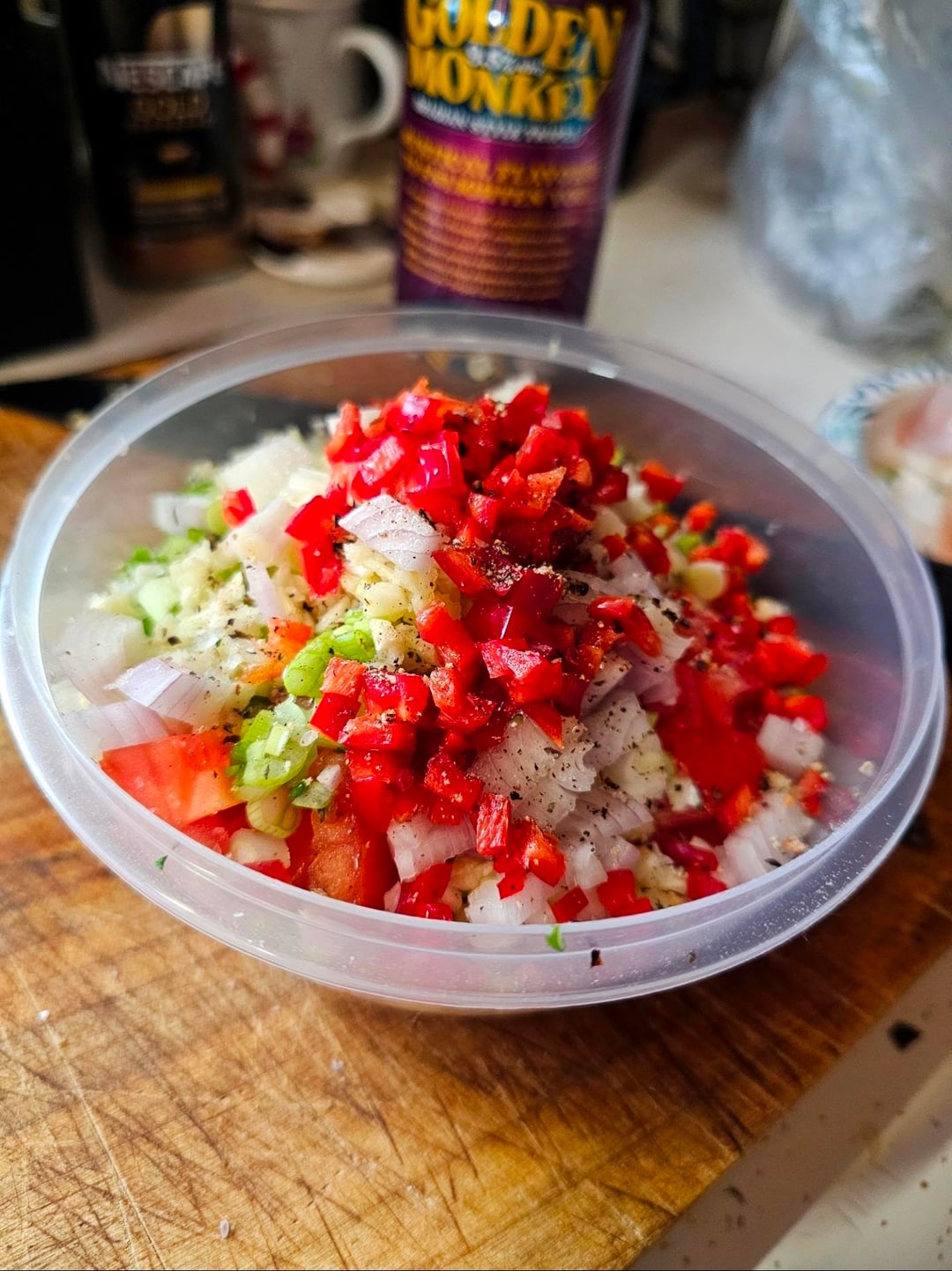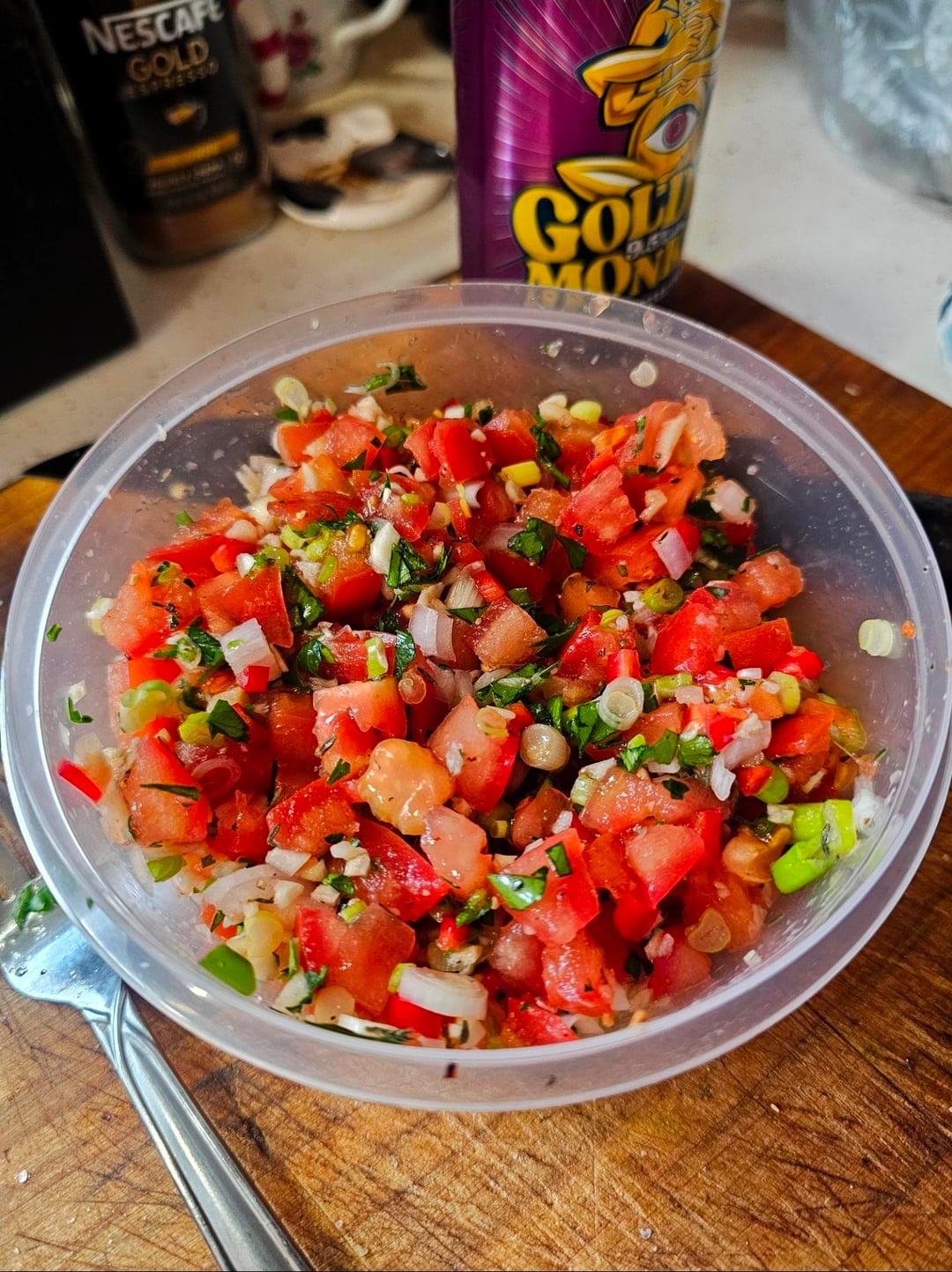 For the pico…mix diced tomato, shallot, garlic, scallion, cilantro, serrano, lime juice, salt, & pepper, then let it chill in the fridge.