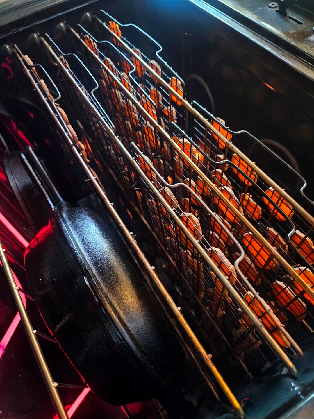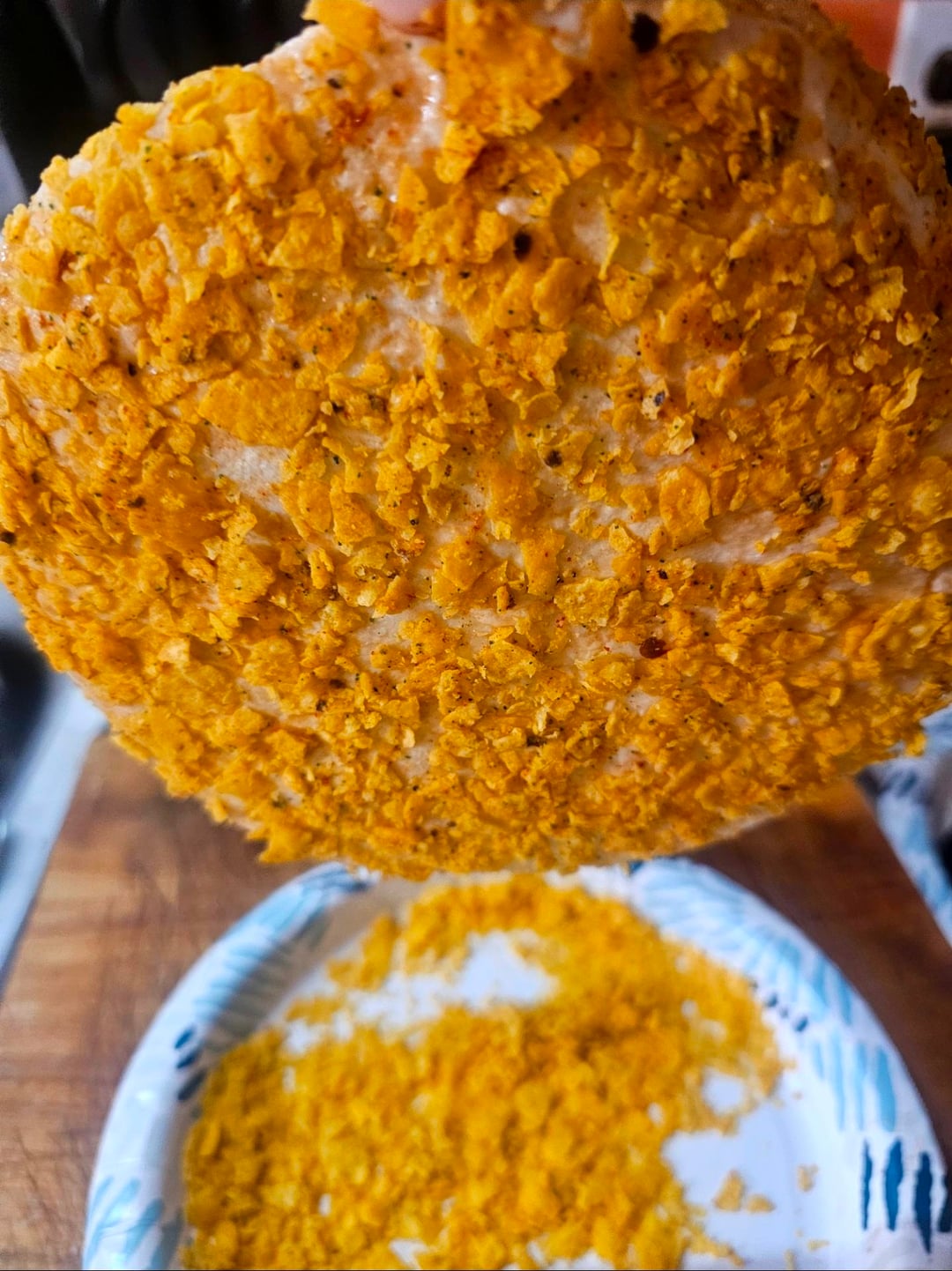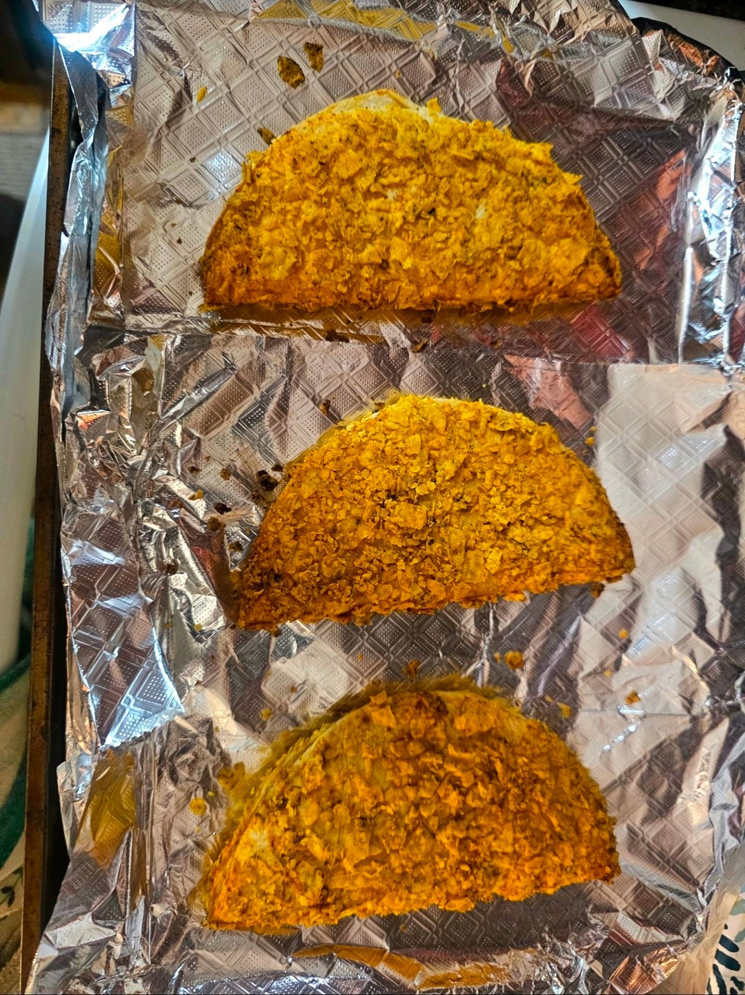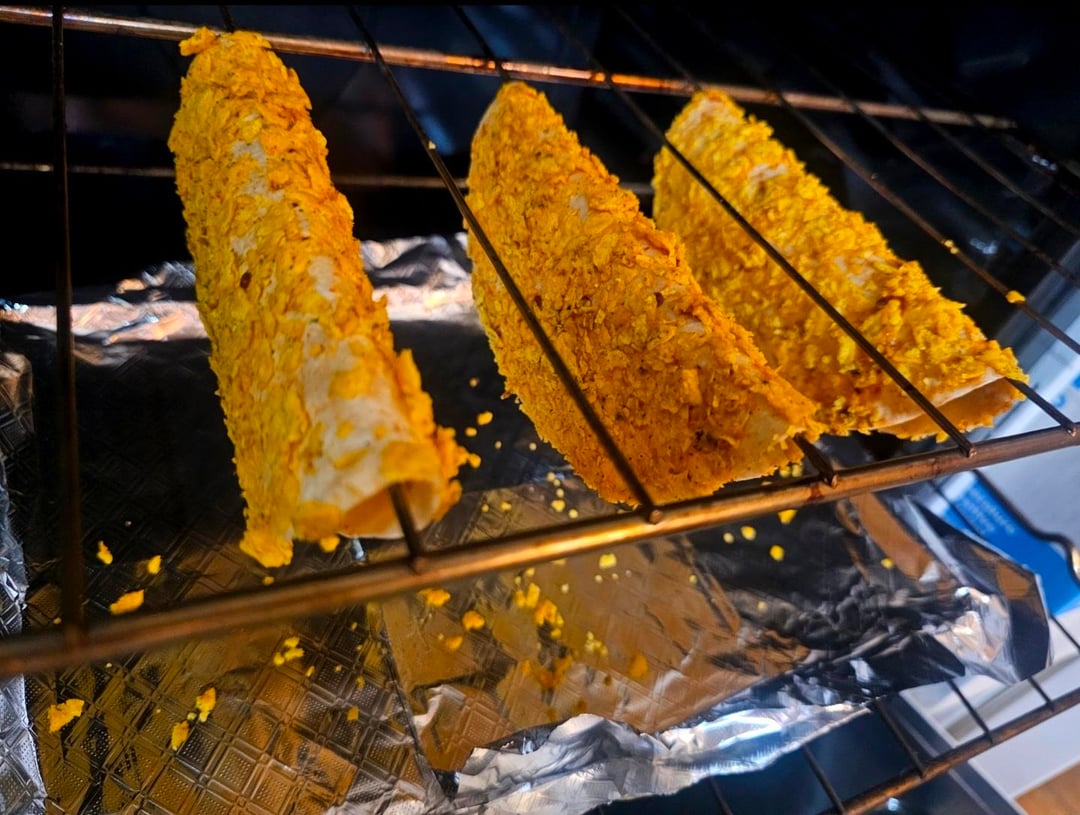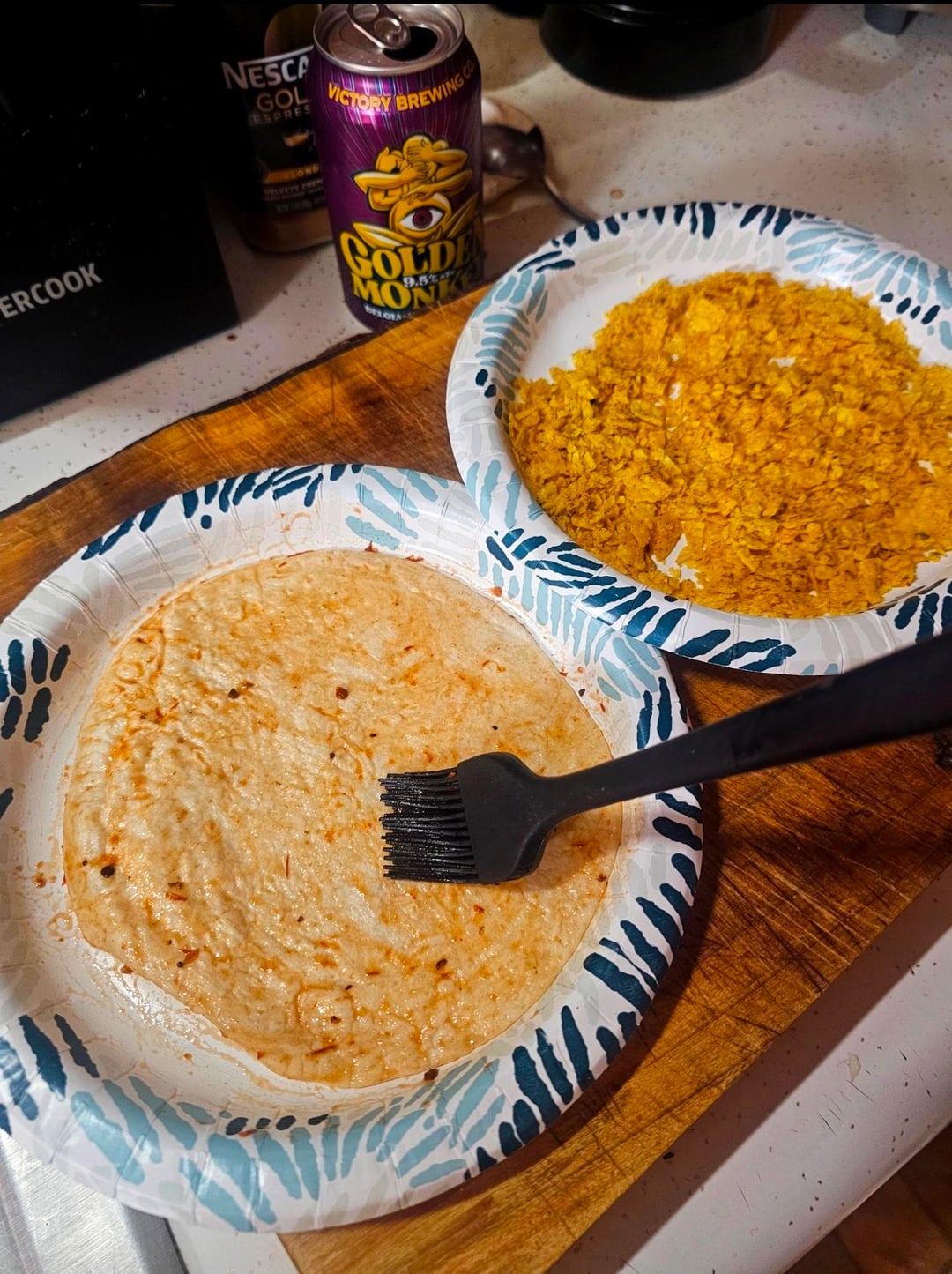 Once the chicken is done brush a few tortillas w/ hot sauce then press them into ranch dorito crumbs. Hang them over the oven rack while it's still warm until they hold shape.