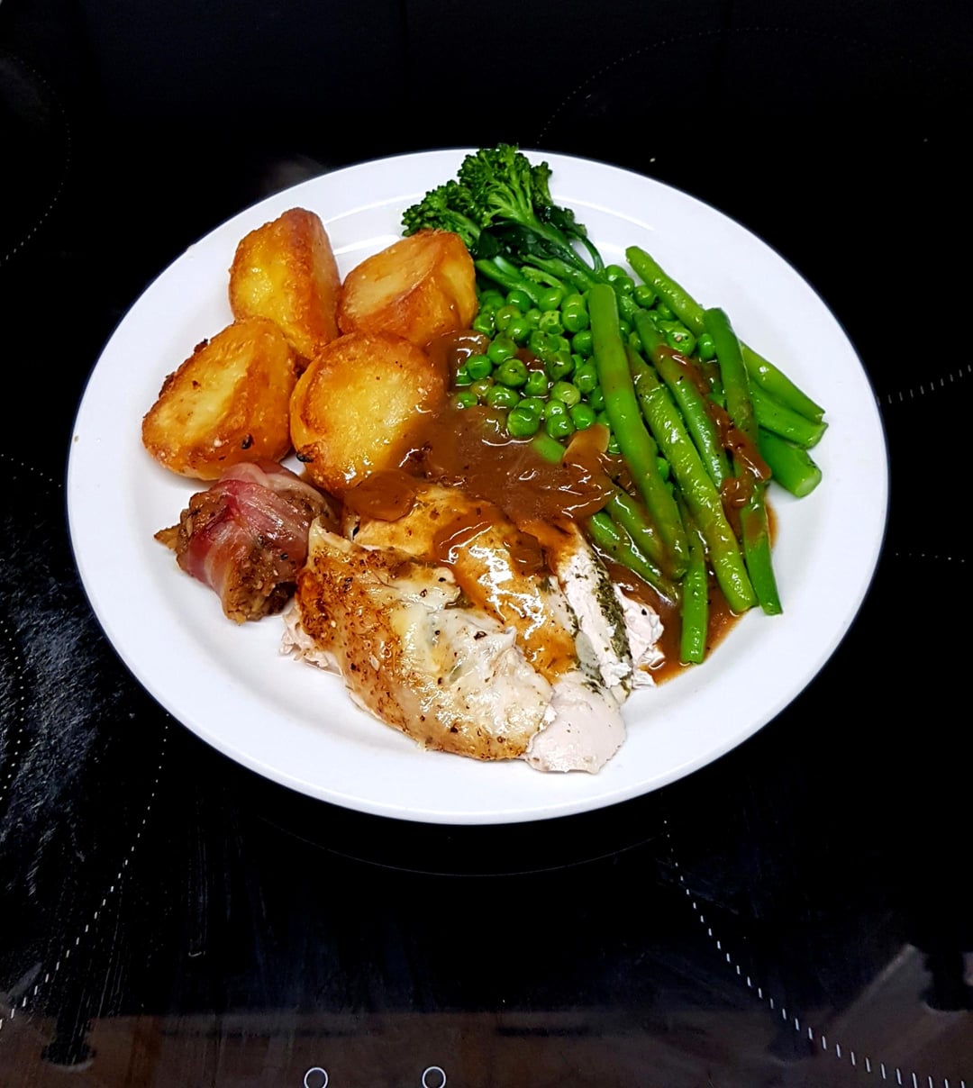 Roast Chicken Crown Stuffed with Garlic Rosemary Butter, Goose Fat Welsh Potatoes, Green Beans, Peas and Brocolli. Stuffing Parcel and White Wine Gravy.