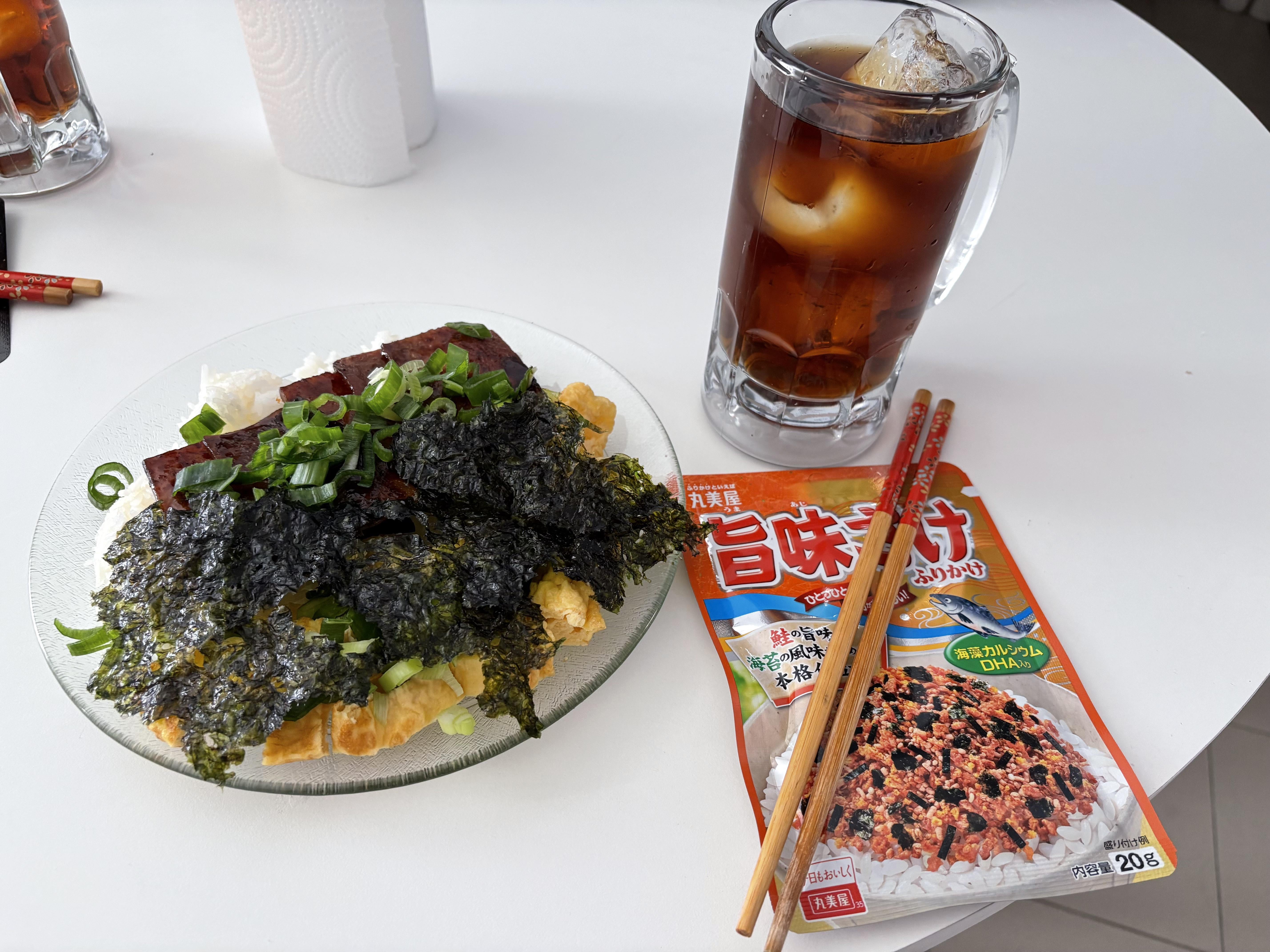 Spam, eggs and rice with plum wine and black tea mixed drink 🙂 by gothclomia Dinner Tonight Tonight's Dinner