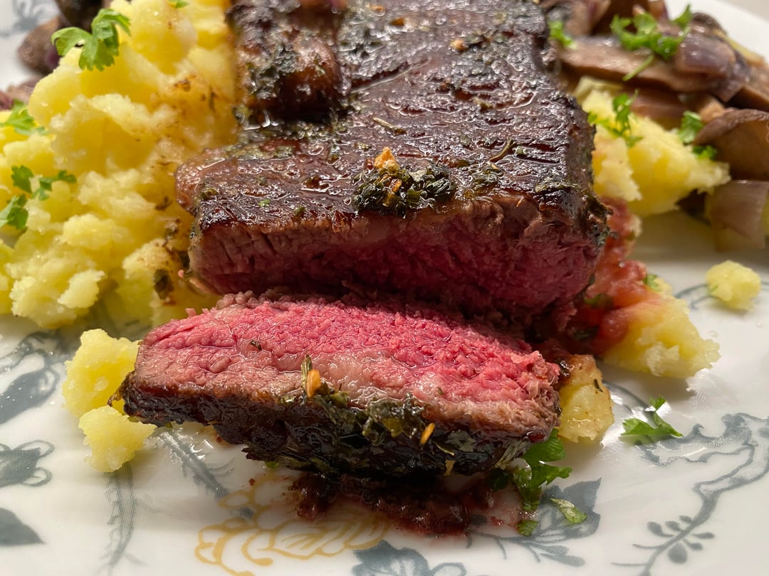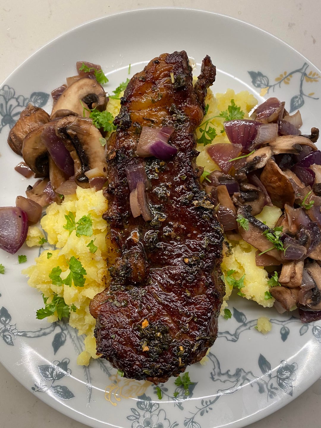 Steak with mashed garlic potatoes, mushrooms and red onions and parsley and butter by NathalieSteenbakker Dinner Tonight Tonight's Dinner