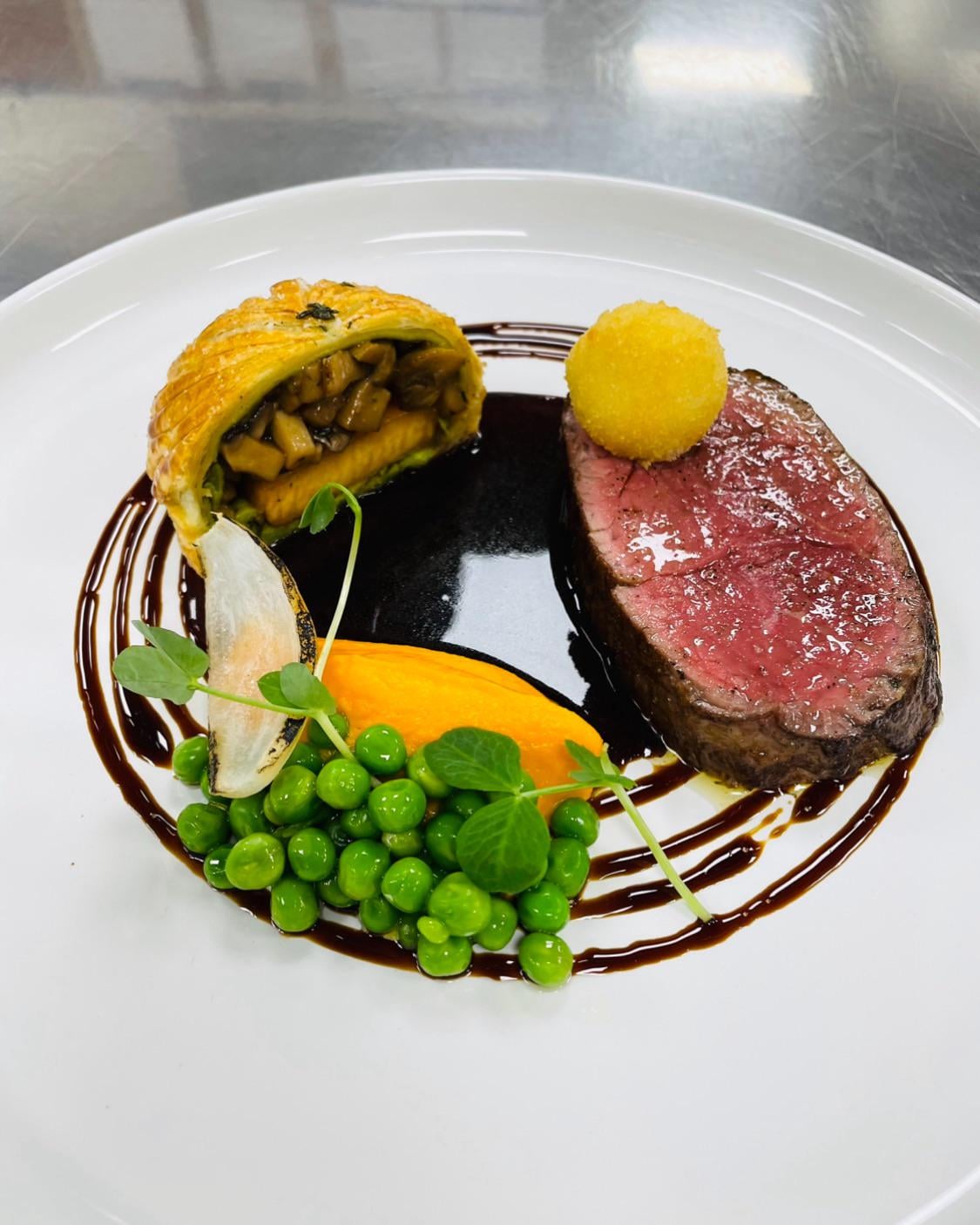 Beef tenderloin – Mushroom and rutabaga pithivier – Carrot purée – Peas – Truffle bordelaise – Crispy goat cheese. by Untetheredsoul-1 Culinary Culinary Plating