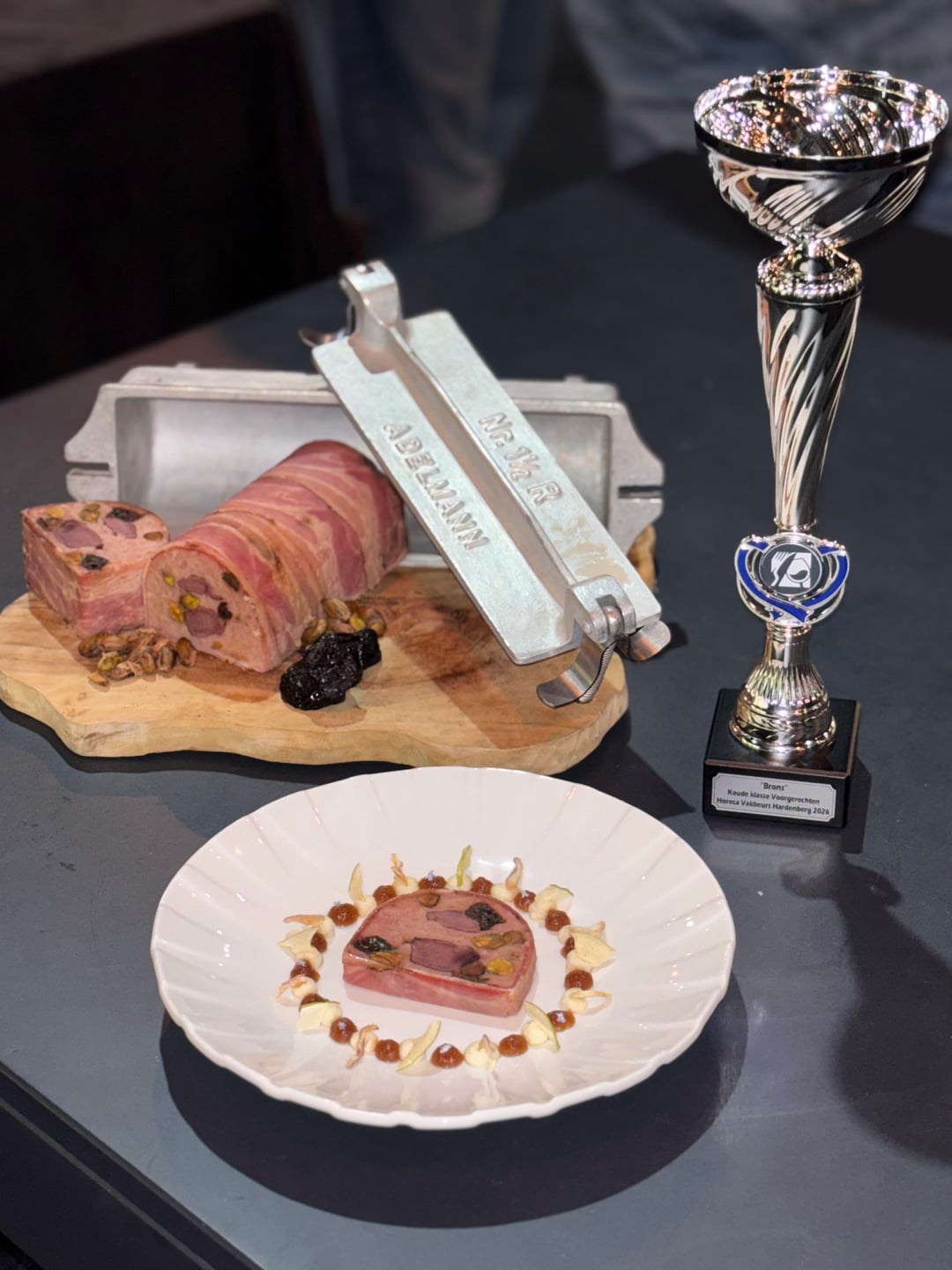 My Terrine with rabbit leg, duck liver, smoked hare saddle, pistachio and plum with katsubushi gel, celeriac cream, dried Granny Smith and shallot. by Southern_Ground_3237 Culinary Culinary Plating