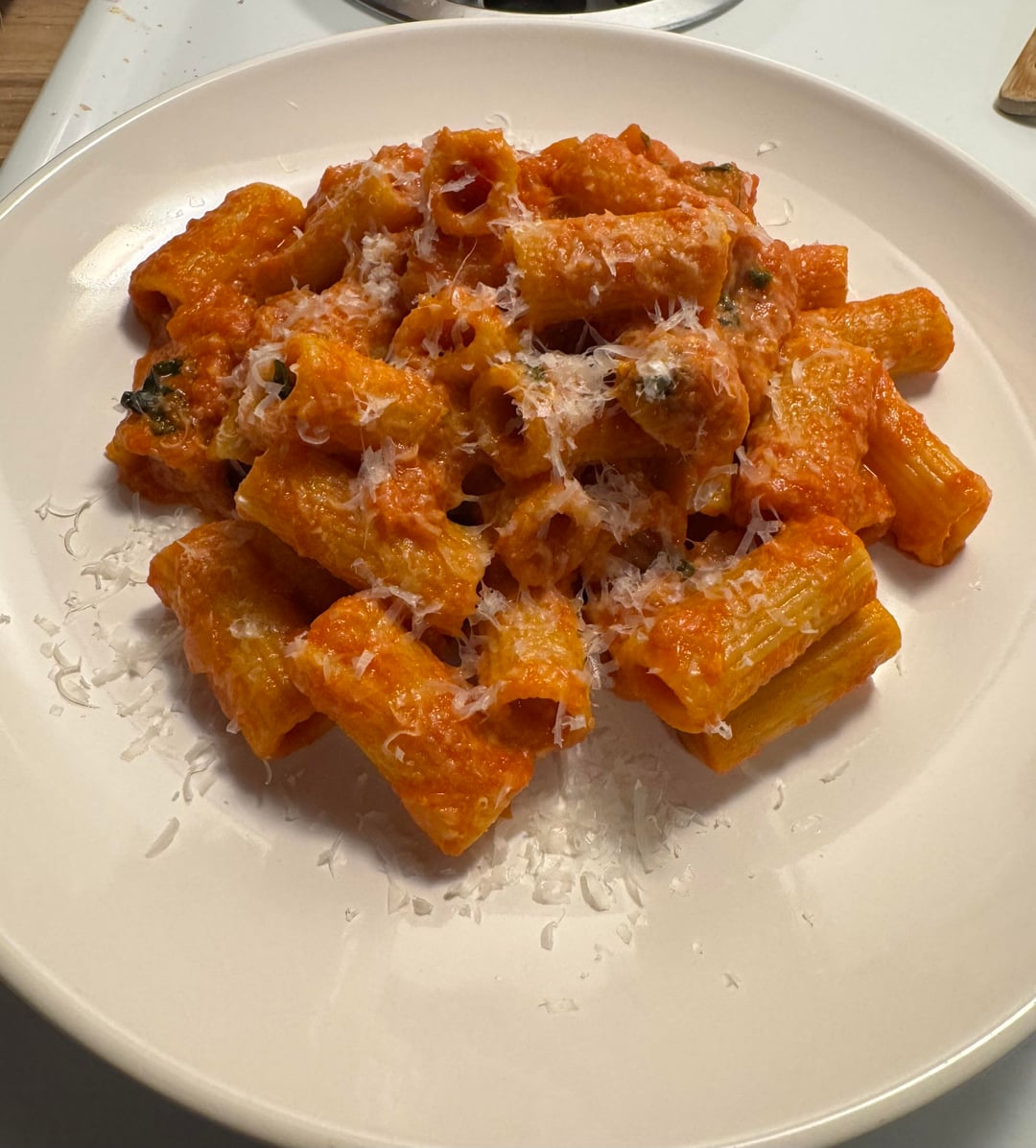 I bought rigatoni and wasn’t sure what to do with it, so I came across this recipe and went for it. Really good! Tomato heavy so pepcid may be necessary. Which, is it true if you add baking soda to your tomato dish, it will help the acid without messing with the flavor?