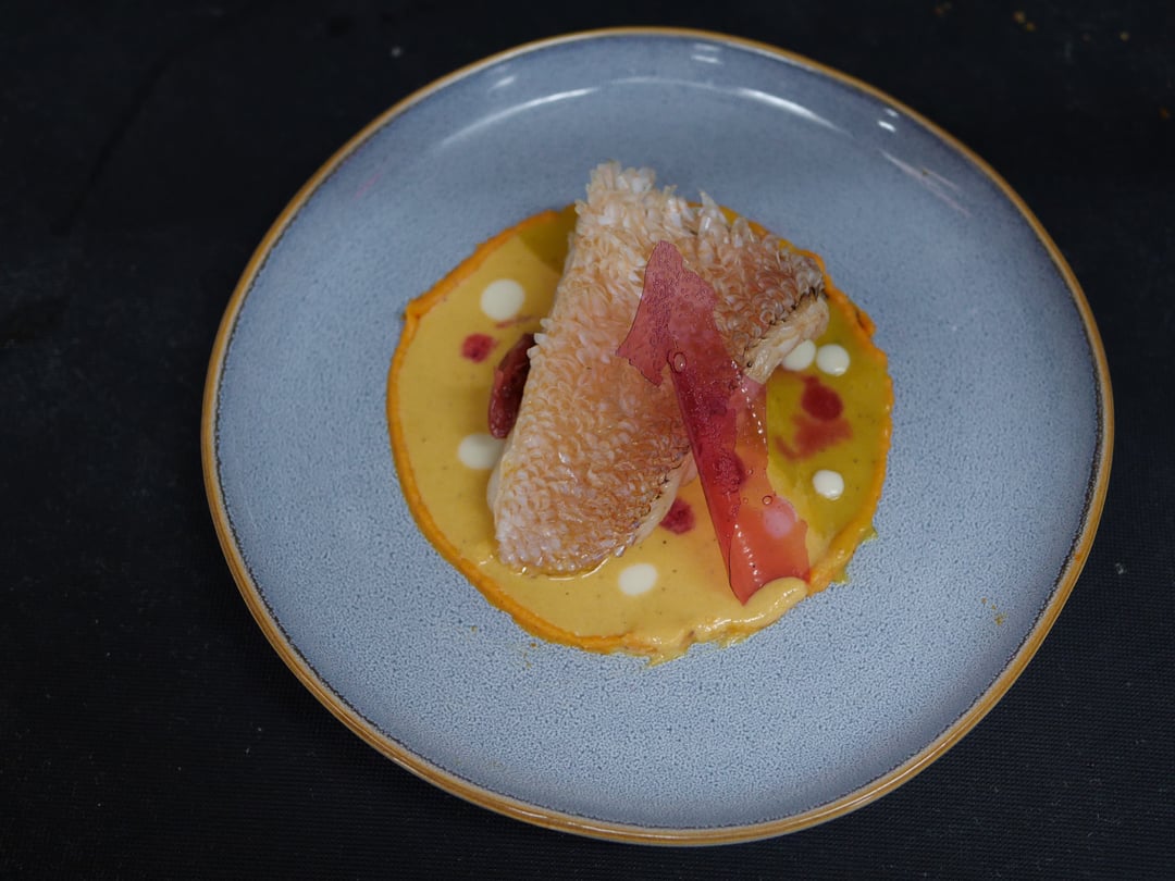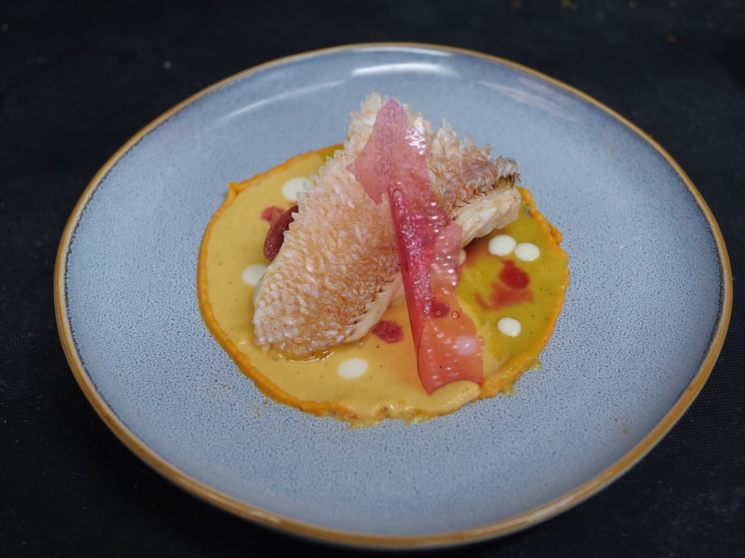Featuring a cranberry "fruit glass" ala chef Eddie shepherd. The fish sits on top of a shallow brown butter tartlette hovering above smoked corn puree, kabocha puree, as well as a koginut puree. Behind the fish is an umeboshi plum, and the dots are Lemon infused coconut cream and cranberry reduction.