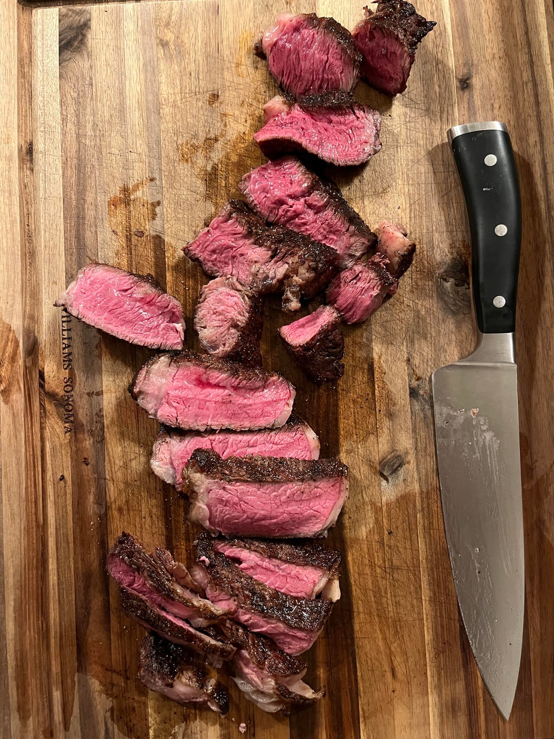 It looks like you grilled the ribeye perfectly, crispy on the outside and juicy on the inside.
