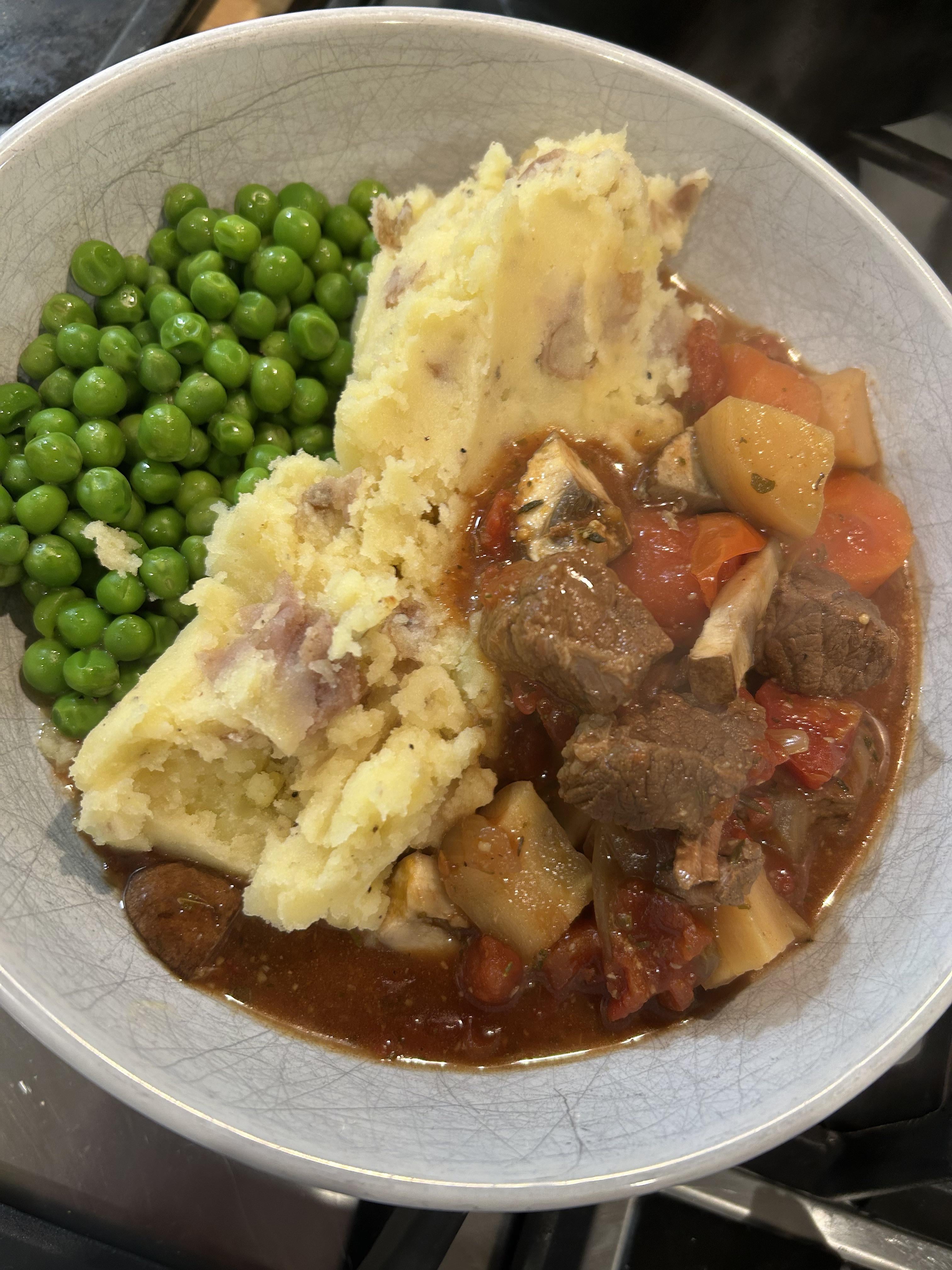 Beef casserole with parsnips carrots and mushroom,served with Skin on Mash and peas by cjp2301 Food Porn