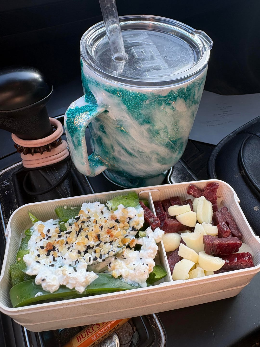 Snack: cut up beef jerky & light laughing cow cheese + built bar