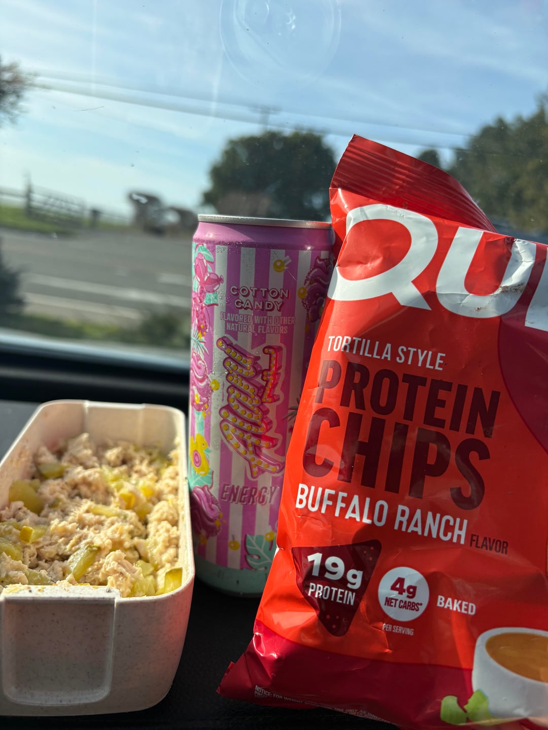 Lunch: tuna, light mayo with pickles & quest chips + Alani