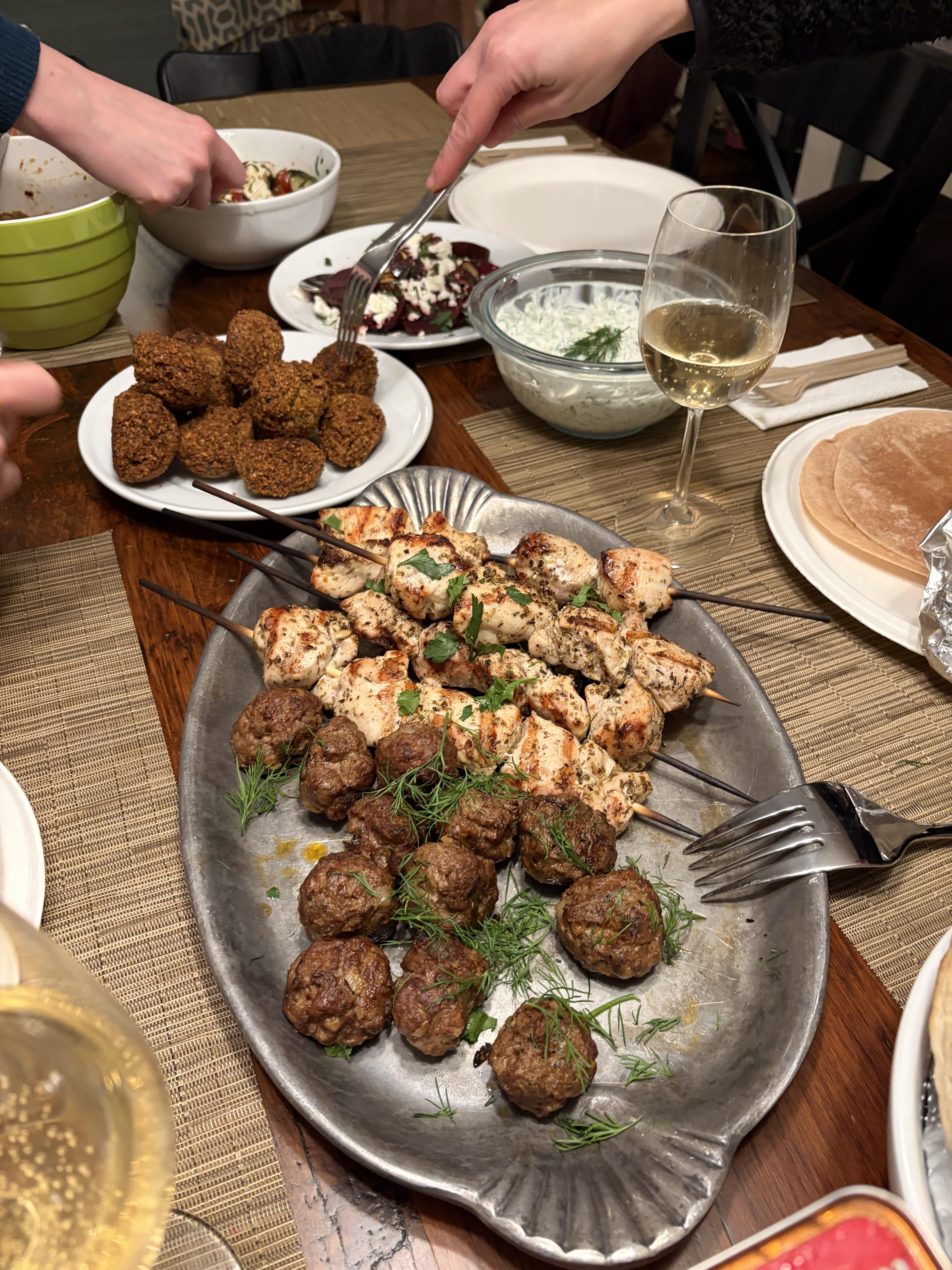[homemade] Falafel,chicken skewers, lamb kofta meatballs