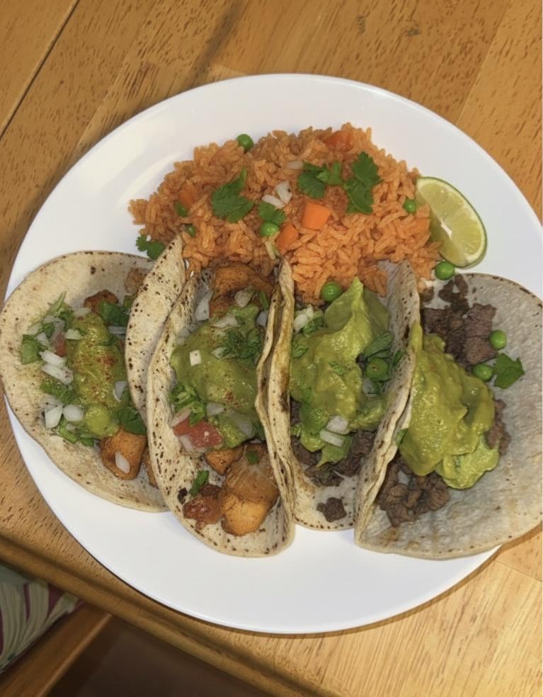 Tacos chicken and asada topped with cilantro, onions. guacatillo and guacamole with a side of Mexican rice by XMAN_TGIRL Food Porn