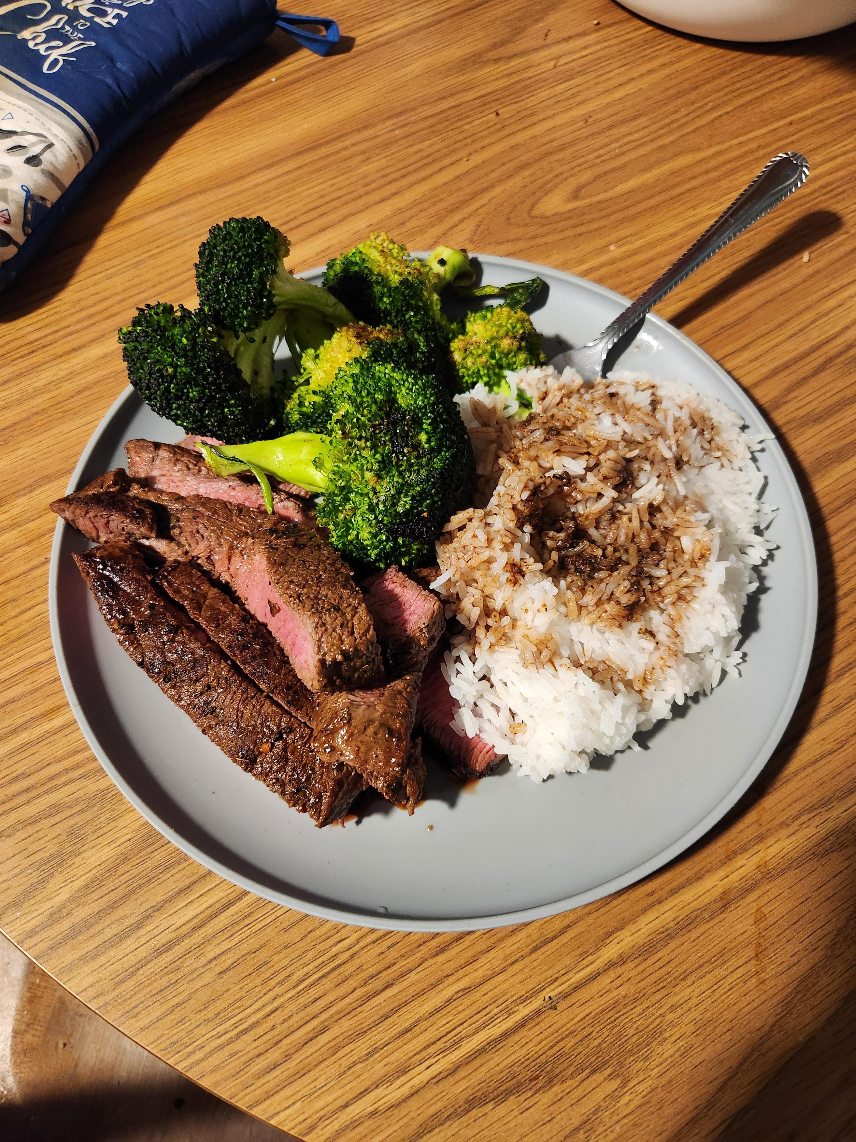 [homemade] medium rare steak with roasted broccooli and rice topped with the steaks leftover juices by ProbablyGonnaEatYou Food
