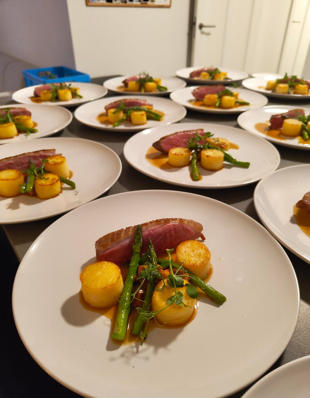 4. If that is pea tendrils, they are not nice to eat, pea shoots on the other hand are very nice to eat. Skin should be rendered more, the potatoes could use a bit more color on top. a small amount of cornstarch for a jus lie would not effect the clarity much but also you could use arrowroot. I use a lot of chicken feet and pigs feet to bolster stocks for sauce that I want to thicken very little, try that perhaps.