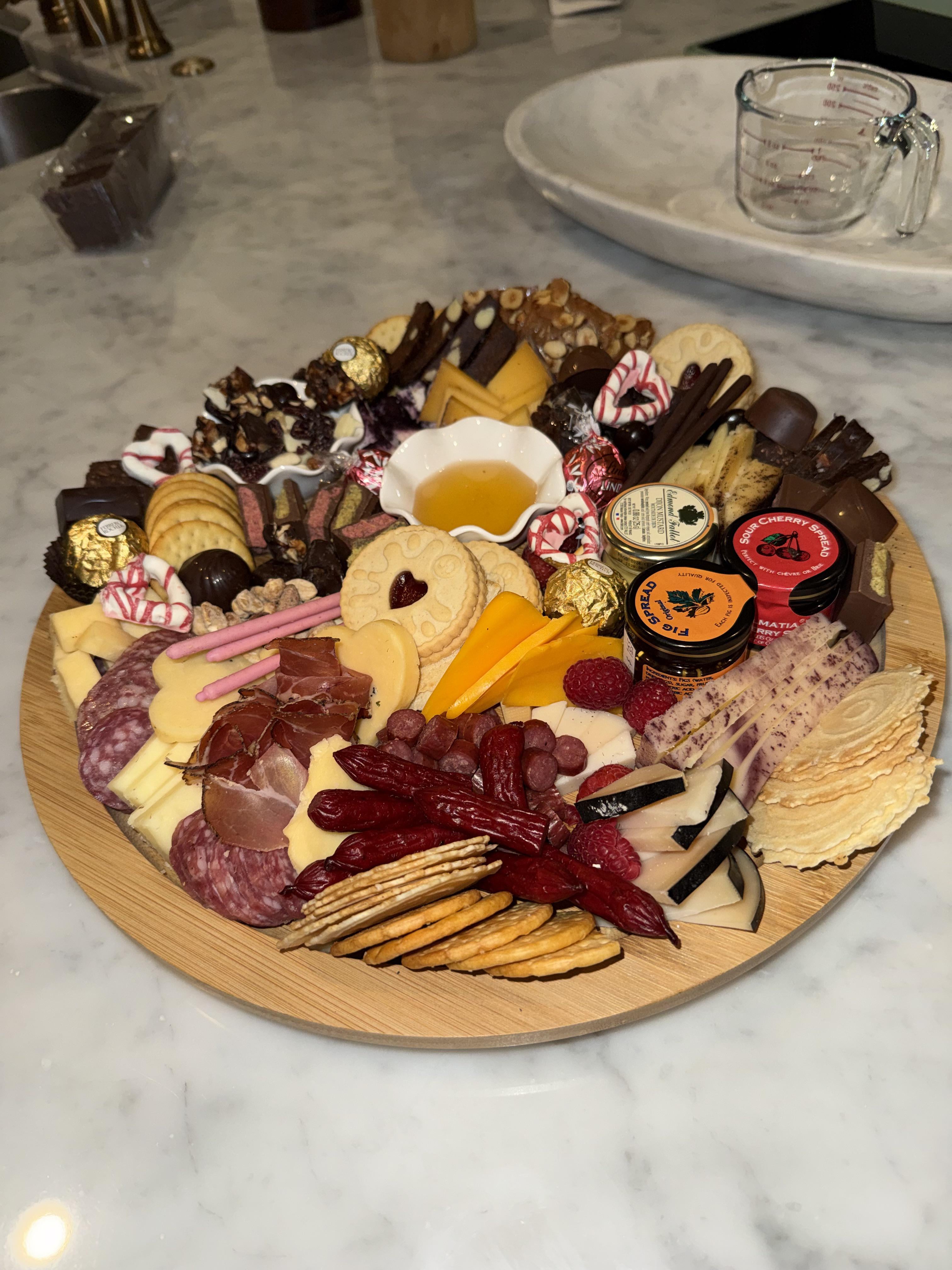 Cheese n chocolate anyone? [OC] valentine’s Day charcuterie, board with a wide variety of cheese and chocolates I made for a Valentine’s Day party