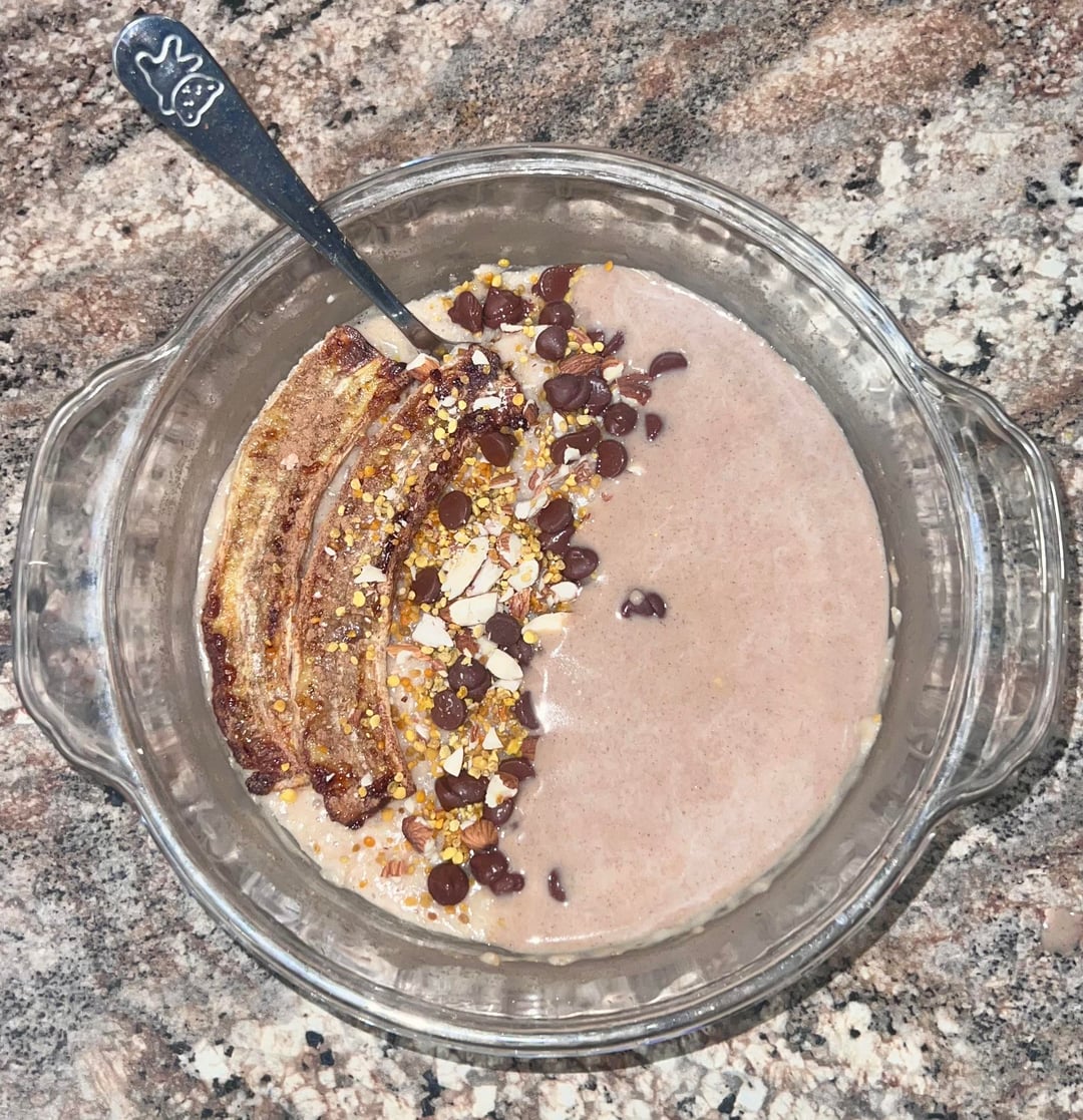 Breakfast : Pumpkin Spice Cheesecake Oatmeal Topped with an air fried banana, bee pollen, crushed almonds, SF salted caramel chocolate chips, and pumpkin spice whey drip – 605 Cals