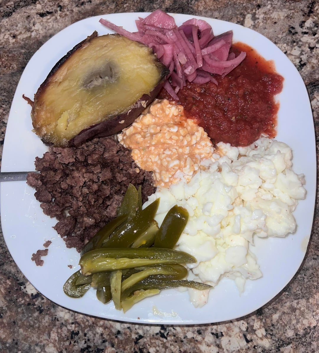 Lunch/Dinner : Japanese Sweet potato, cottage cheese mixed with hot sauce, salsa, ground beef, egg whites, pickled jalapeños , and onions – 627 Cals