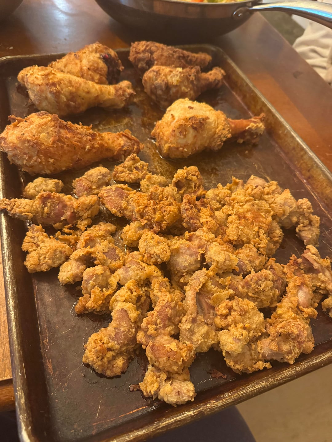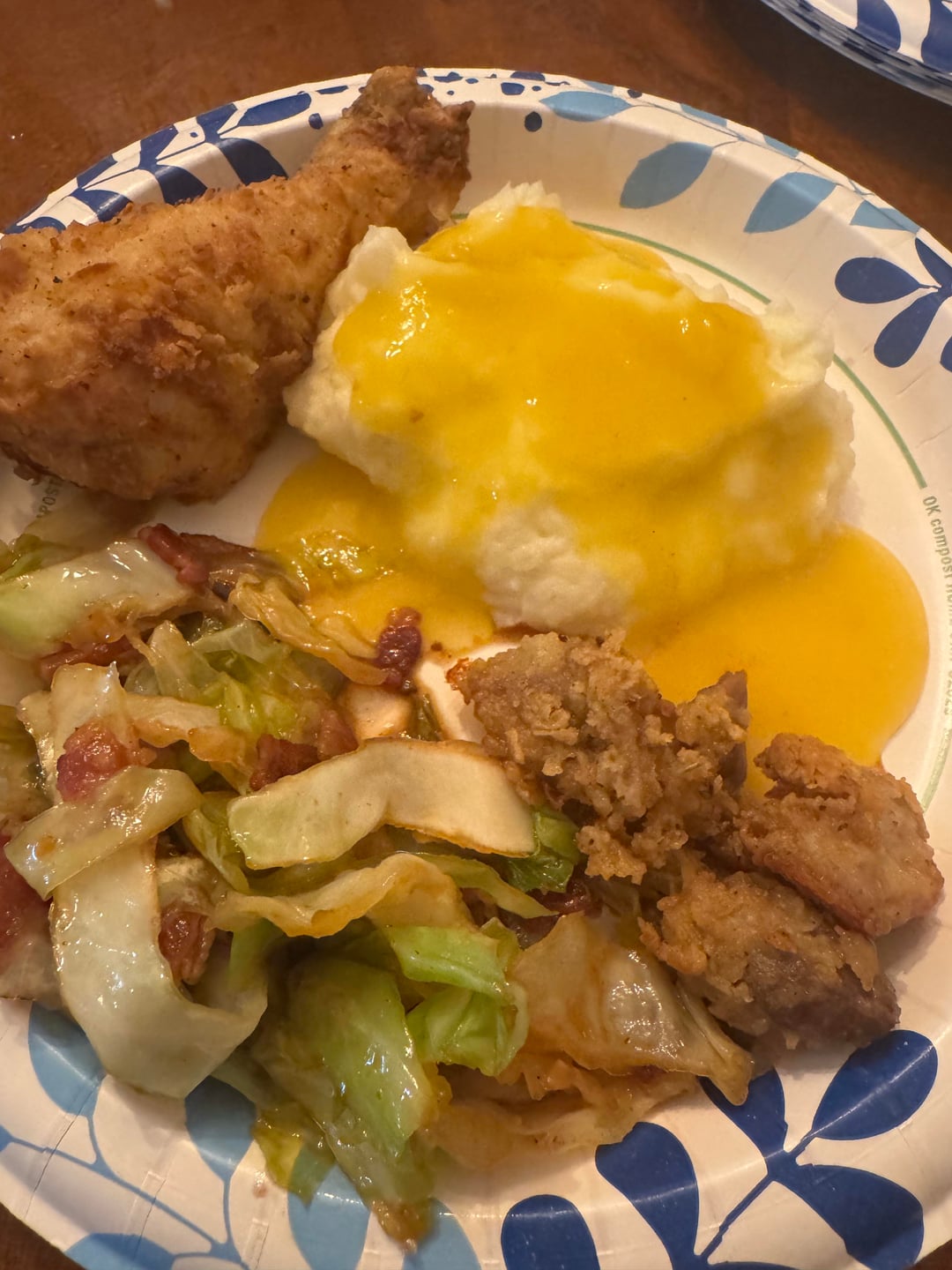 Fried Chicken Drumsticks, Gizzards &Hearts. Creamy Mashed Potatoes, chicken Gravy, and spicy fried cabbage with bacon.