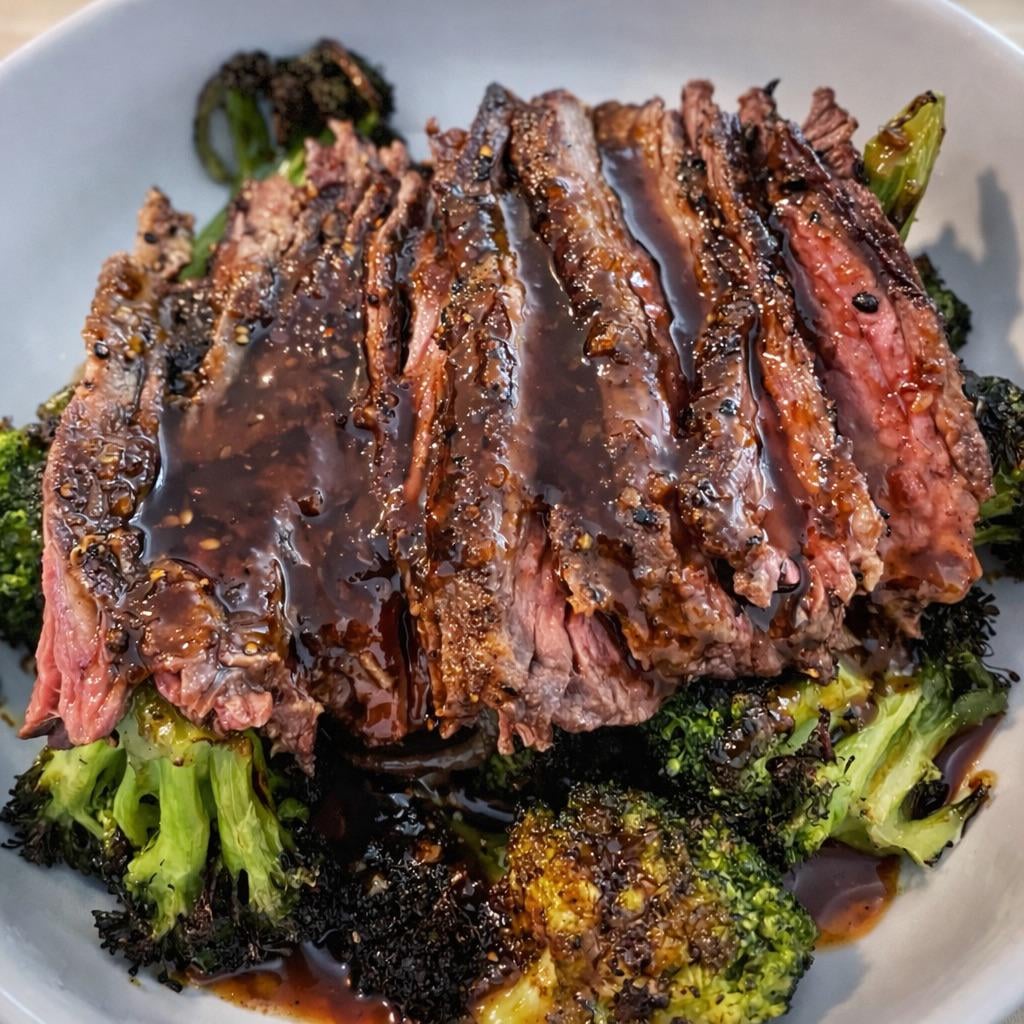 Korean BBQ skirt steak over crispy broccoli