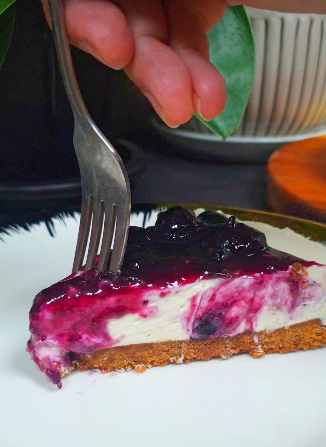 Homemade no-bake blueberry cheesecake with a biscuit base, creamy vanilla filling, and blueberry topping. Feedback welcome 😊 by LetsCookWithHina Food