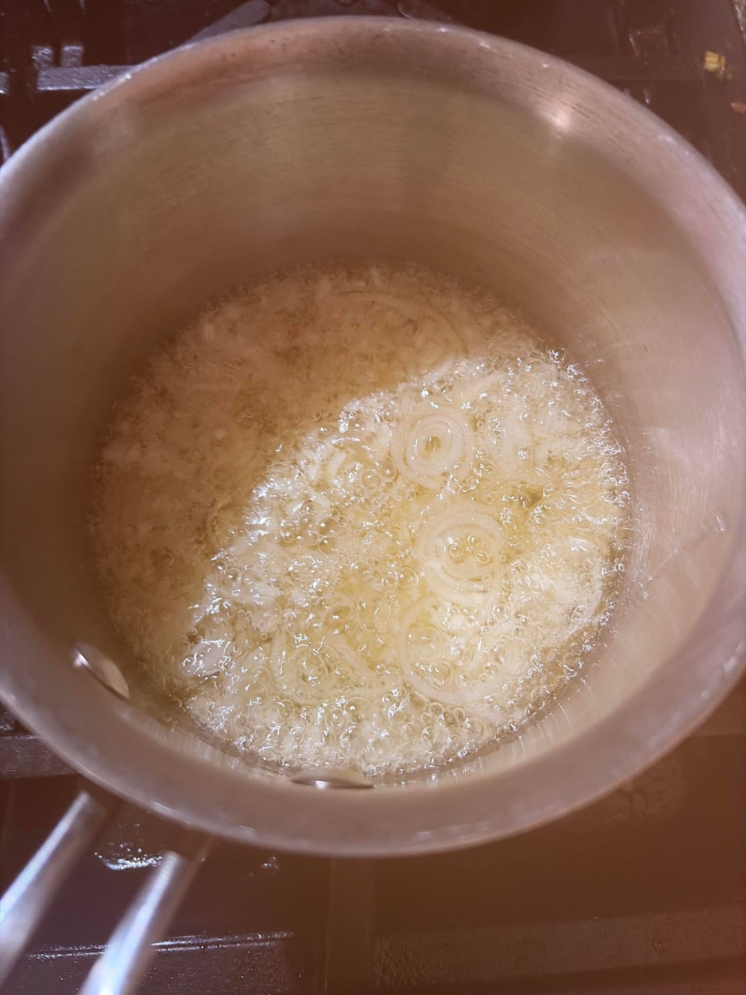 1. Add oil, garlic, and shallots into a small dry pan and slowly bring to 375°f (if you do not have a thermometer that goes that high dip a wood spoon handle into the oil, if there are bubbles around the bottom it’s hot enough.) **DO NOT ADD SHALLOTS AND GARLIC TO THE PAN AFTER HEATING THIS WILL BE MESSY!!**